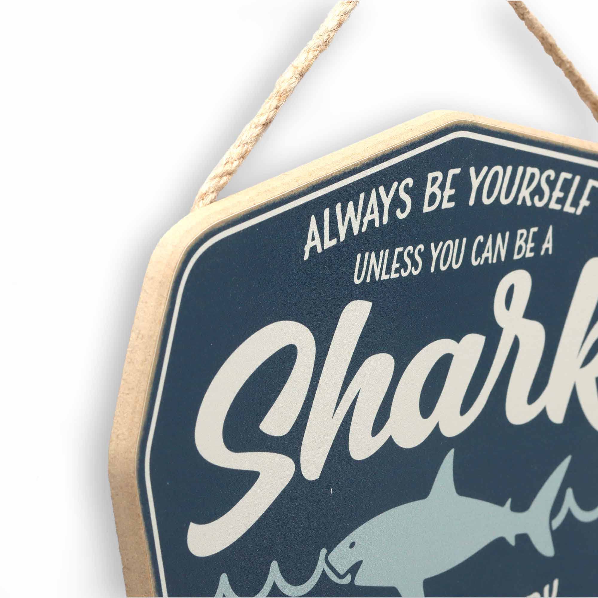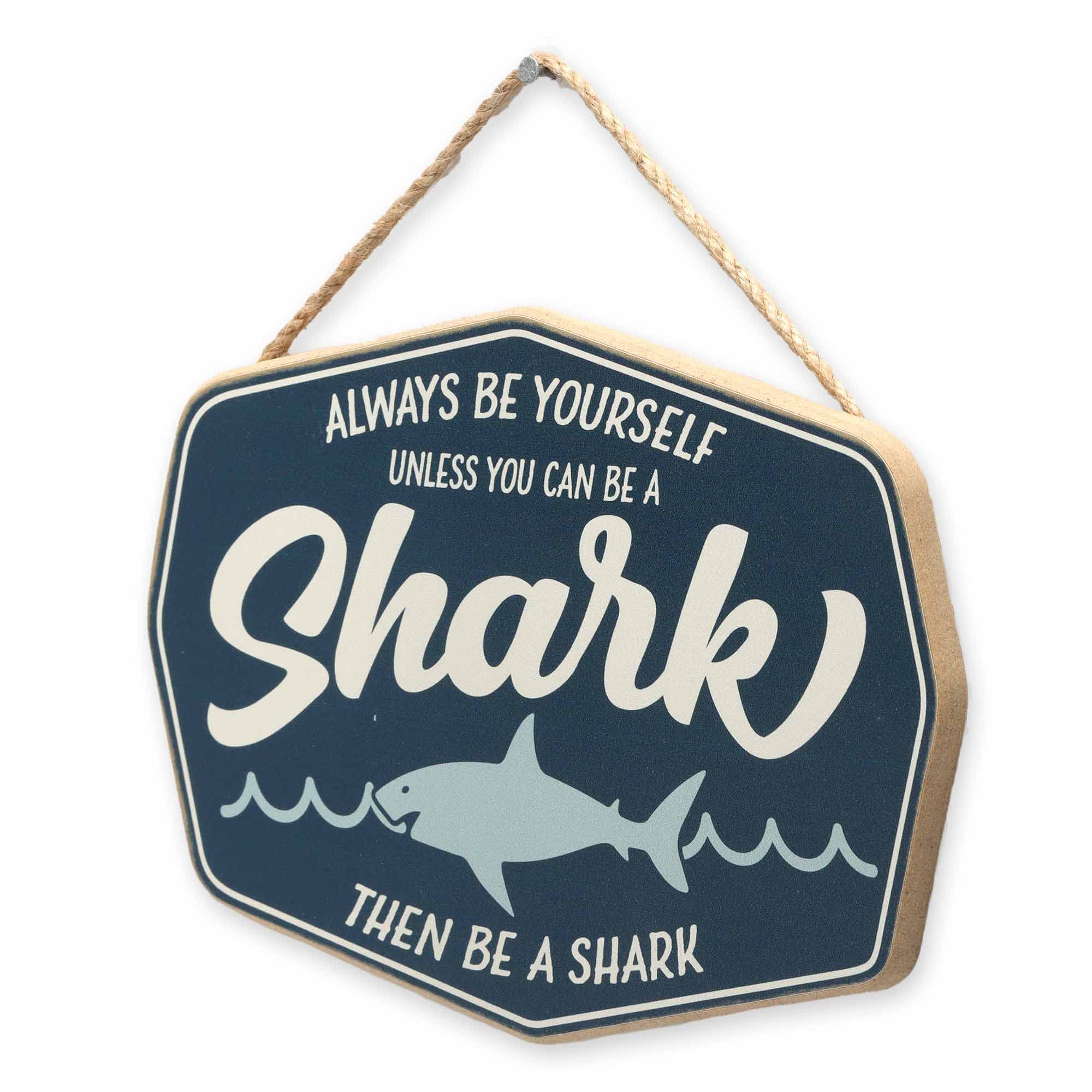 Fun Vintage Sign: With text that reads, "Always be yourself unless you can be a shark - then be a shark," a blue and white color palette, and a shark silhouette, this wall art is as fun as can be.