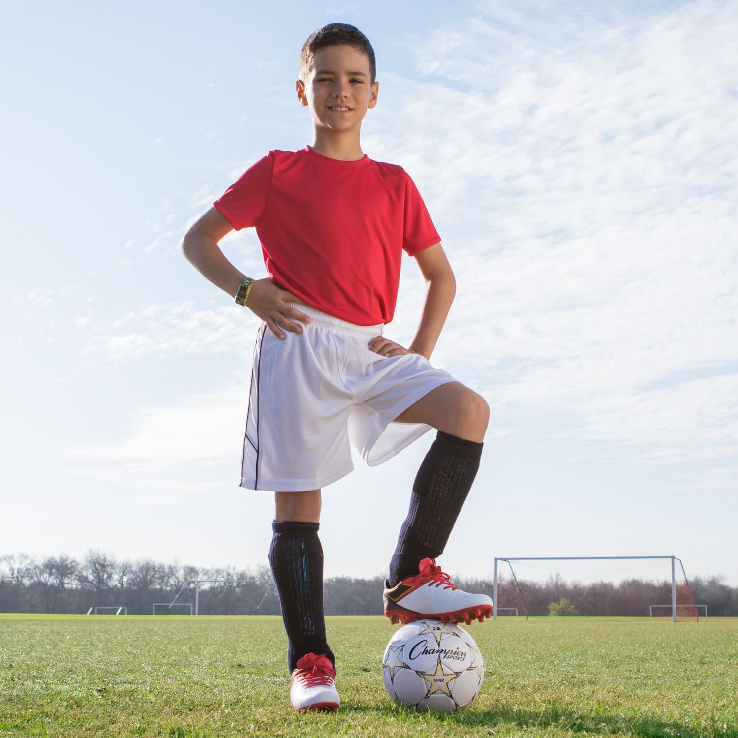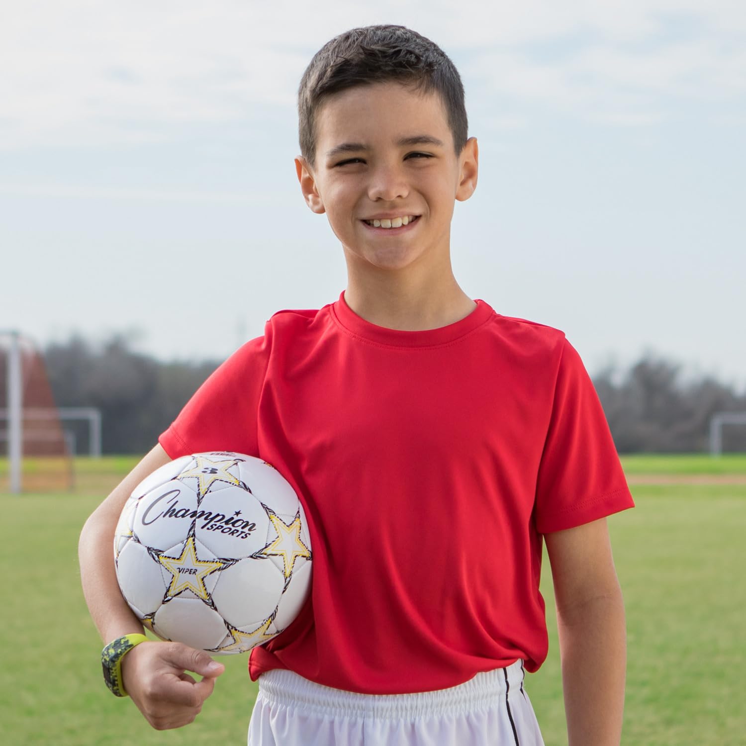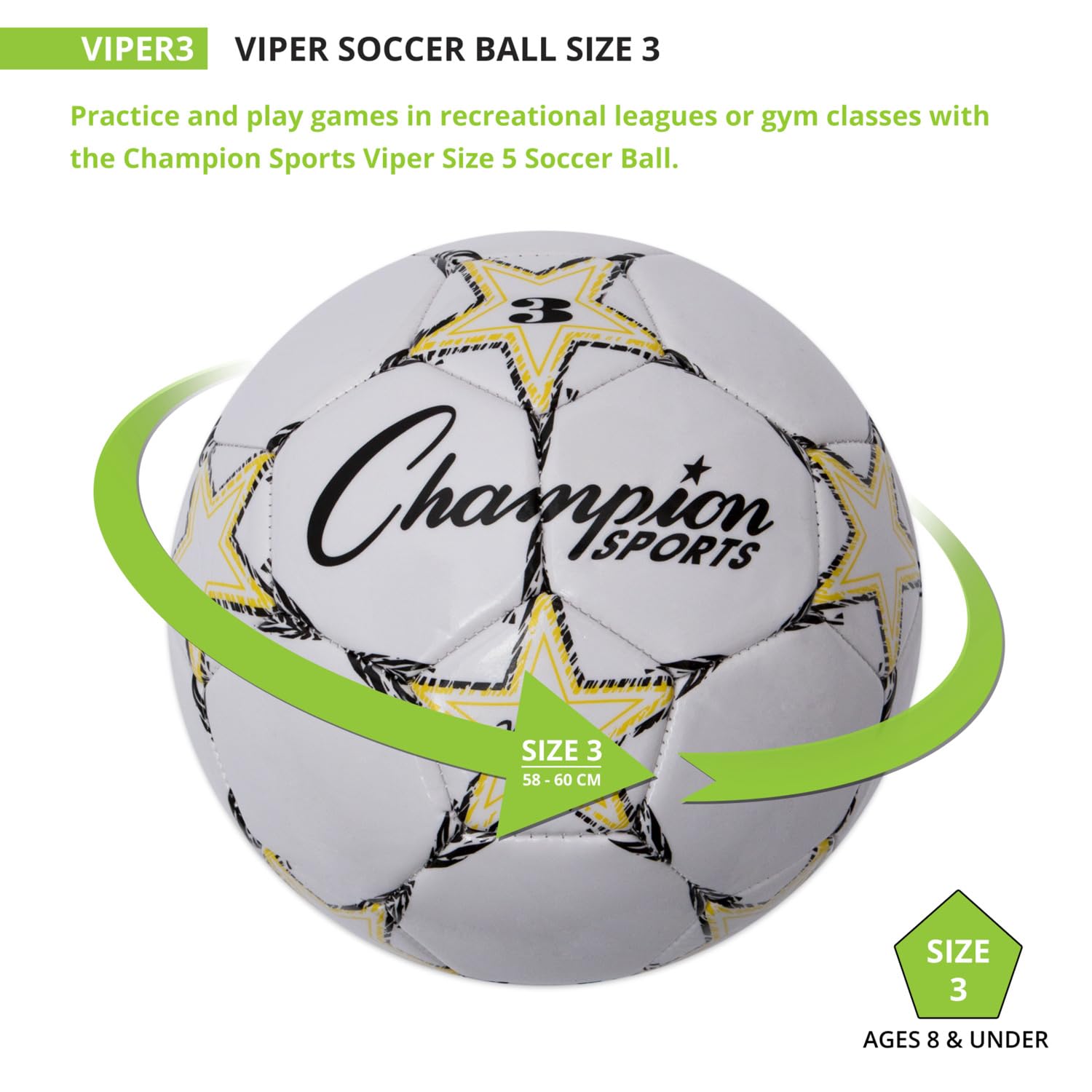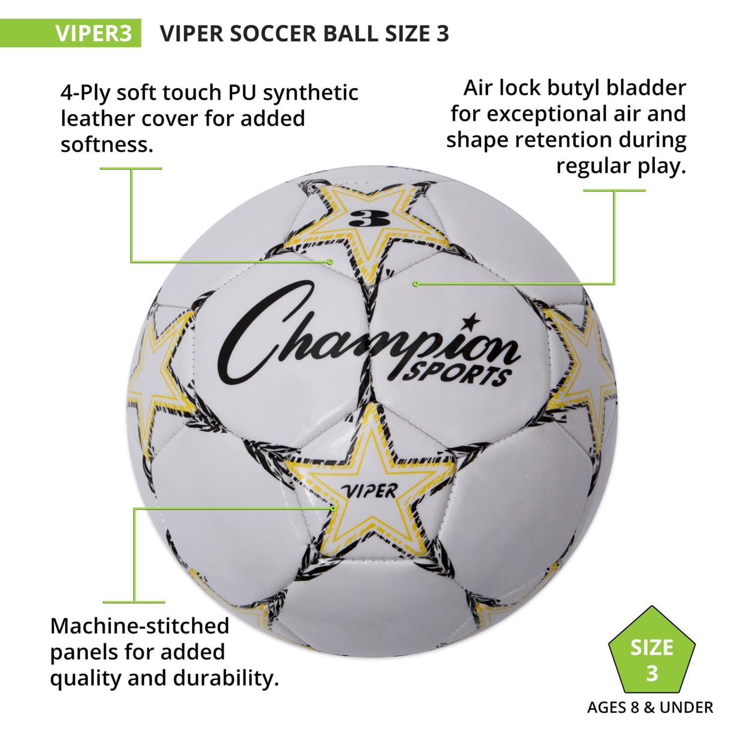A great choice for young players or recreational use, the Champion Sports Viper Soccer Ball prioritizes comfort and durability. The soft-touch TPU cover makes heading, kicking, and blocking the ball easier on young athletes, while the airlock butyl bladder and machine-stitched panels ensure the ball retains its shape and air pressure throughout regular play. This versatile soccer ball can be used indoors or outdoors, and comes in a variety of sizes to suit your needs: VIPER3 (Yellow/Black/White) for ages 8 & under, VIPER4 (Red/Black/White) for ages 8 to 12, and Official size VIPER5 (Blue/Black/White) for ages 12 & up.