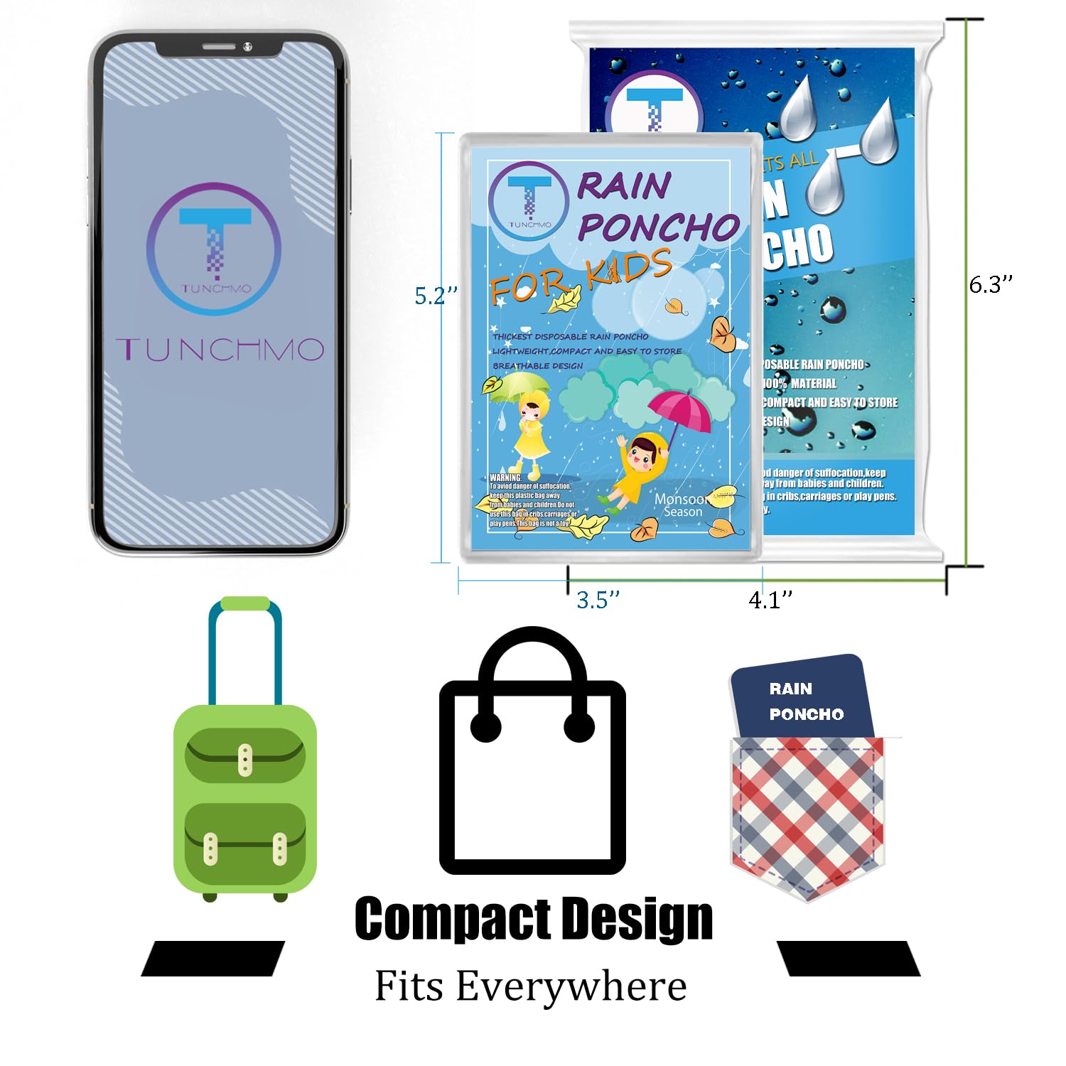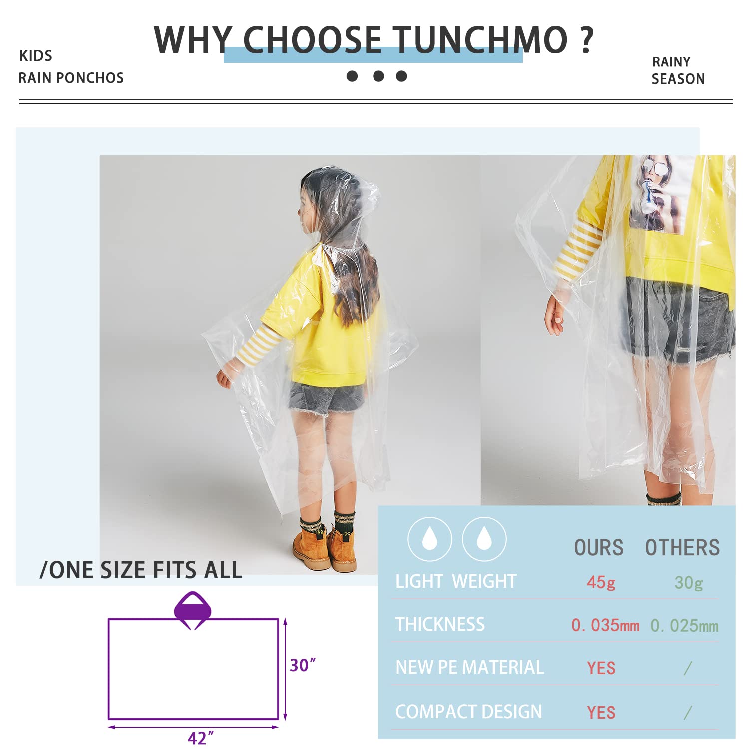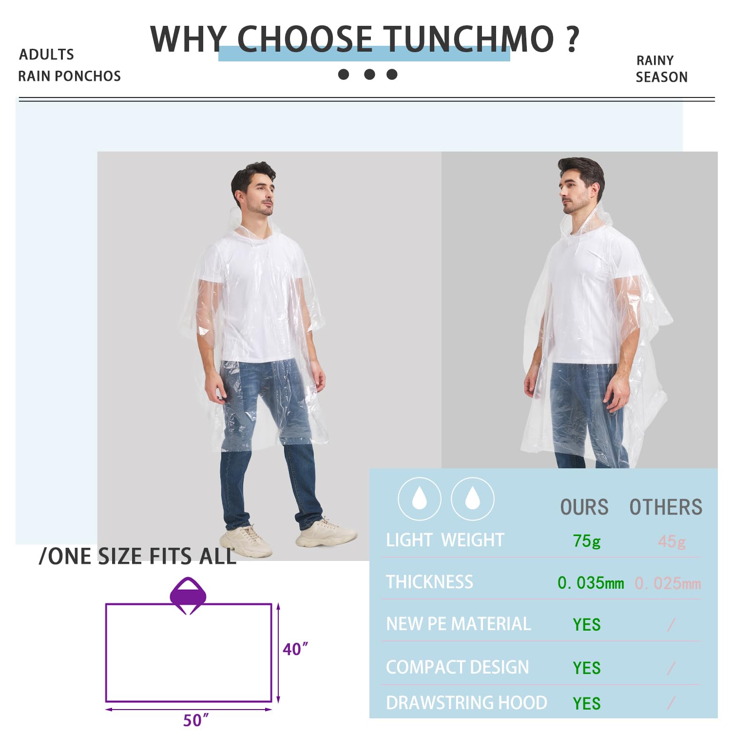 STOP WASTING MONEY ON CHEAP FLIMSY DISPOSABLE RAIN PONCHOS – The TUNCHMO EMERGENCY RAIN PONCHOS comes with a hat rope to keep your head drier is your PERFECT CHOICE as the rain ponchos made from 0,035 mm thick PE plastic this clear white rain poncho is the THICKEST you will ever find that also fits in your pocket