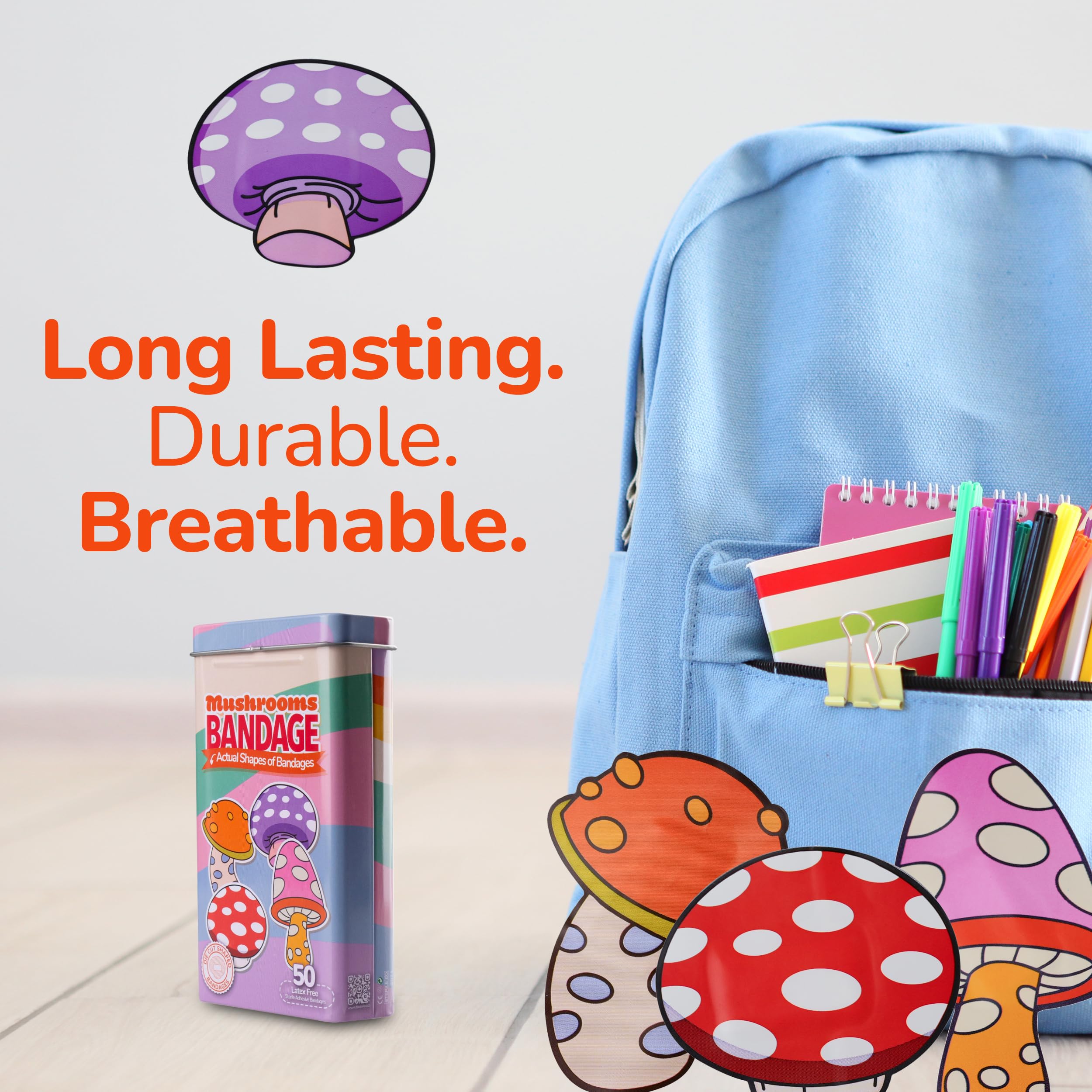 50 MUSHROOM BANDAGES: Mushroom-shaped adhesive bandages tin helps protect cuts, scrapes, and minor wounds while making healing less stressful; bandages come in 4 assorted styles