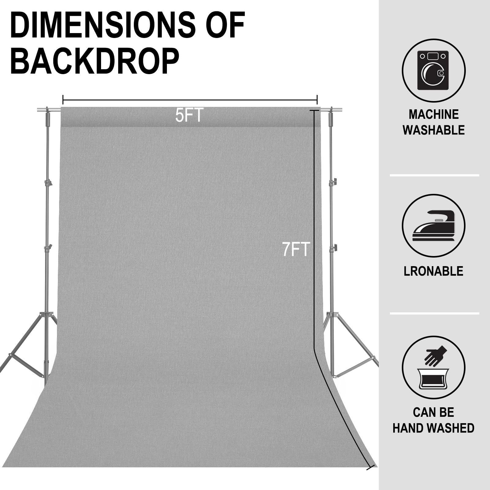 5ftx7ft grey photography backdrop background, 100% polyester, completely seamless, offer a good result for shooting. Only the backdrop, no include a stand.
