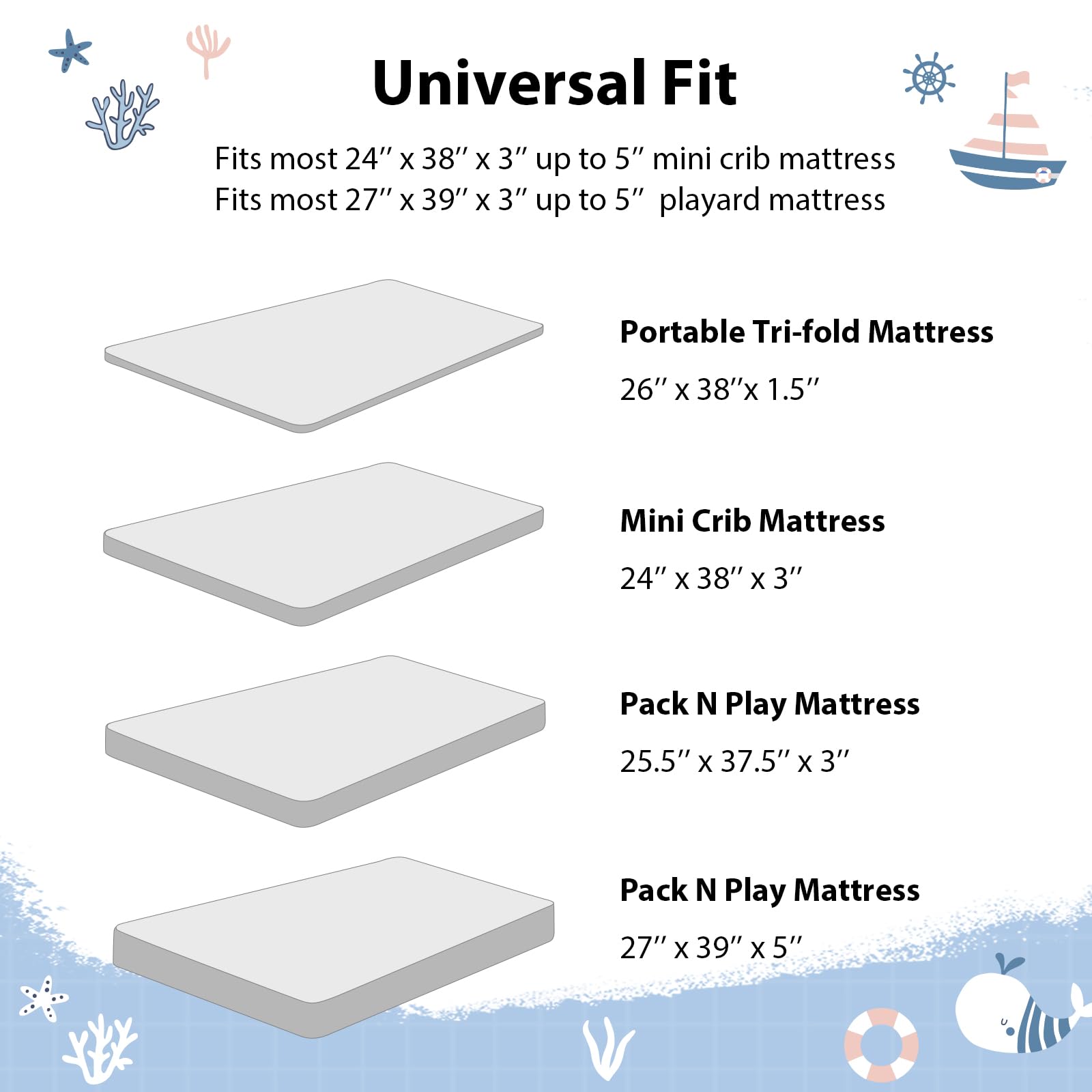 Snug Fit: Measuring 38” x 26”, our 3-pack mini crib sheets fit most baby portable plapens and pack n play mattresses. With elastic bands around the edges of the playard sheets, an 6-inch deep pocket, and stretchy fabric, they ensure a snug, wrinkle-free fit that stays securely in place.