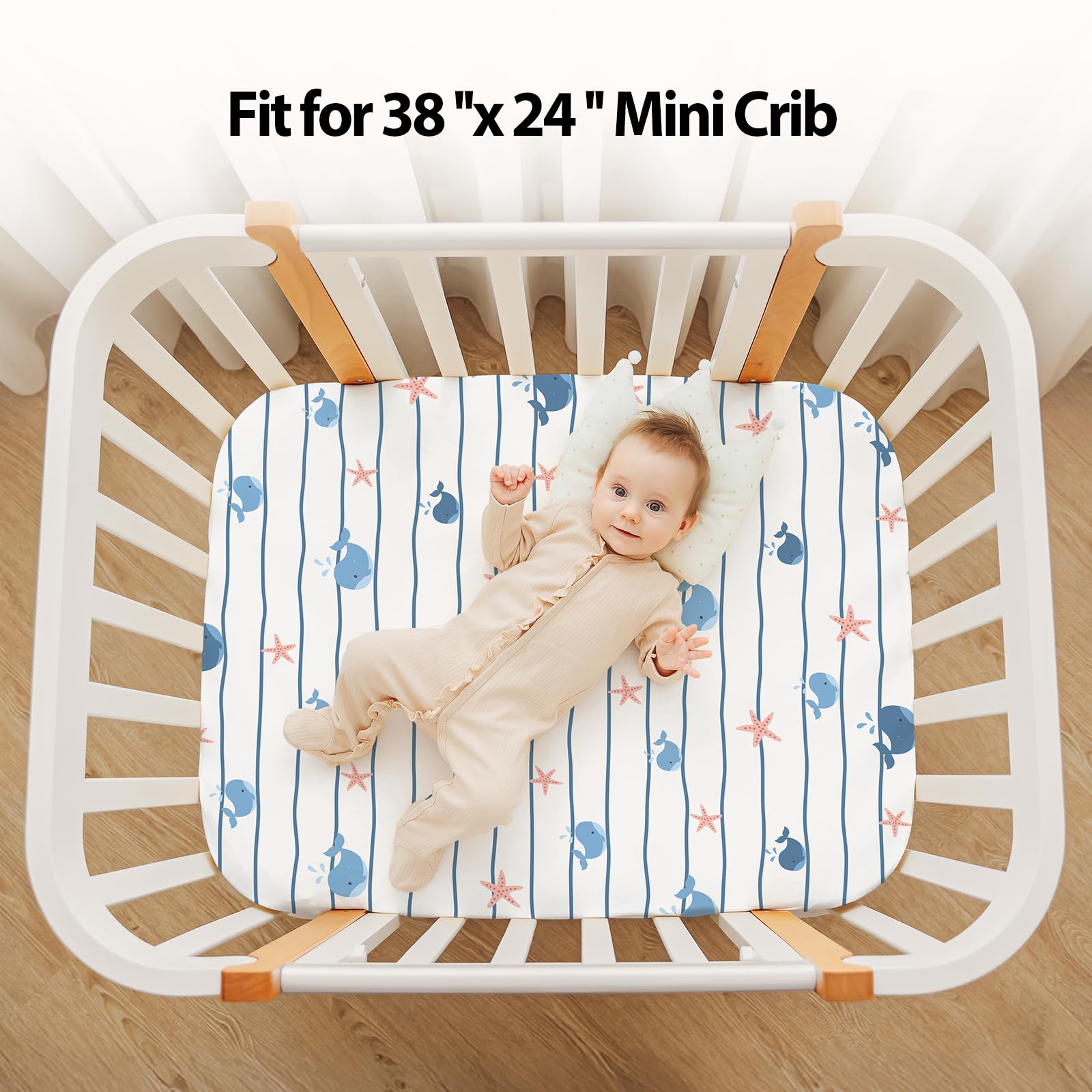 FIEMOL Baby Mini Crib Sheets Boy, Portable 38”x26” Pack and Play Sheets Fitted for Playard and Pack N Play Mattress, 3-Pack Soft Microfiber Blue Ocean Whale
