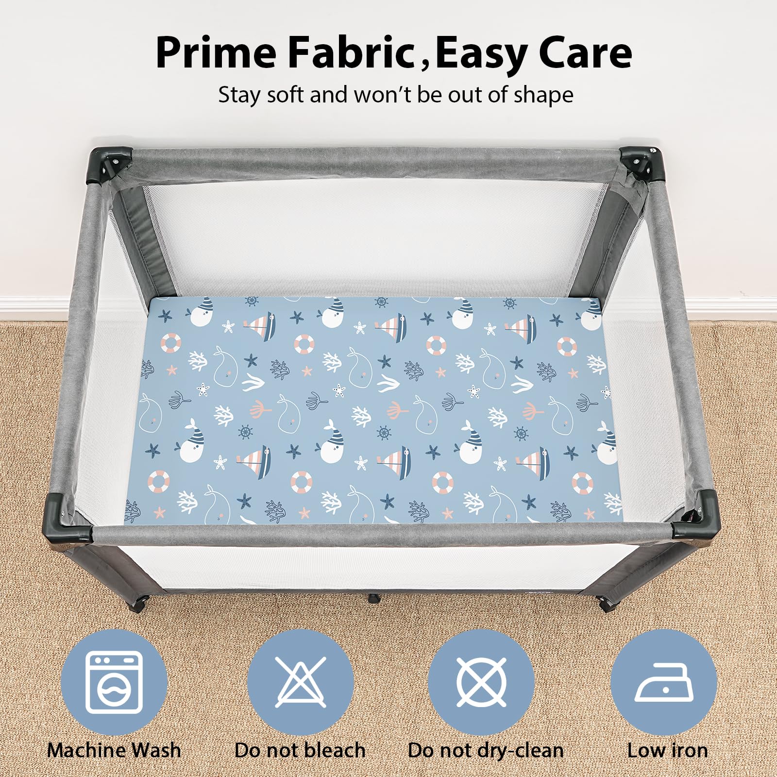 Easy Care & Sustainable: Made from pre-shrunk fabric, our pack n play sheets resist fading, pilling, and shrinking, even after hundreds of machine washes. With double-stitched edges and corners, they are built to last, ensuring comfort for your baby.