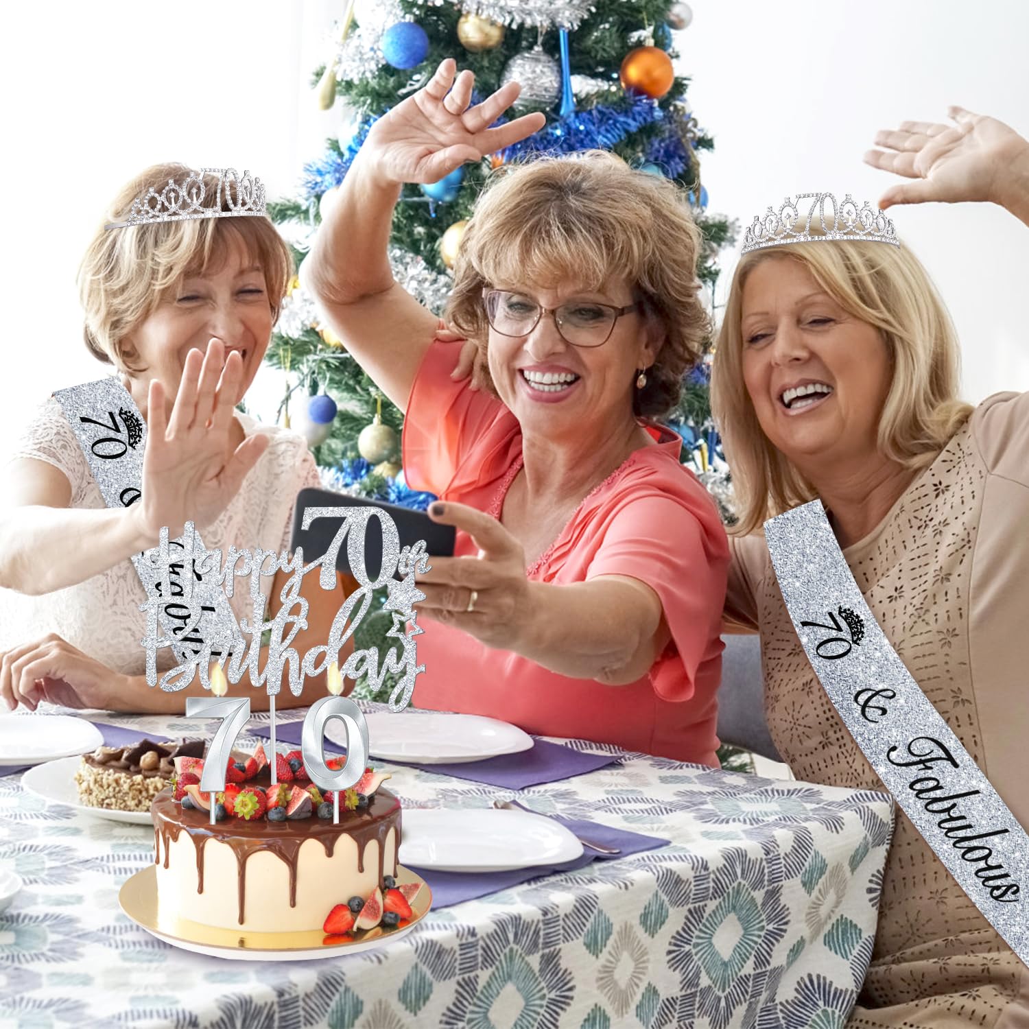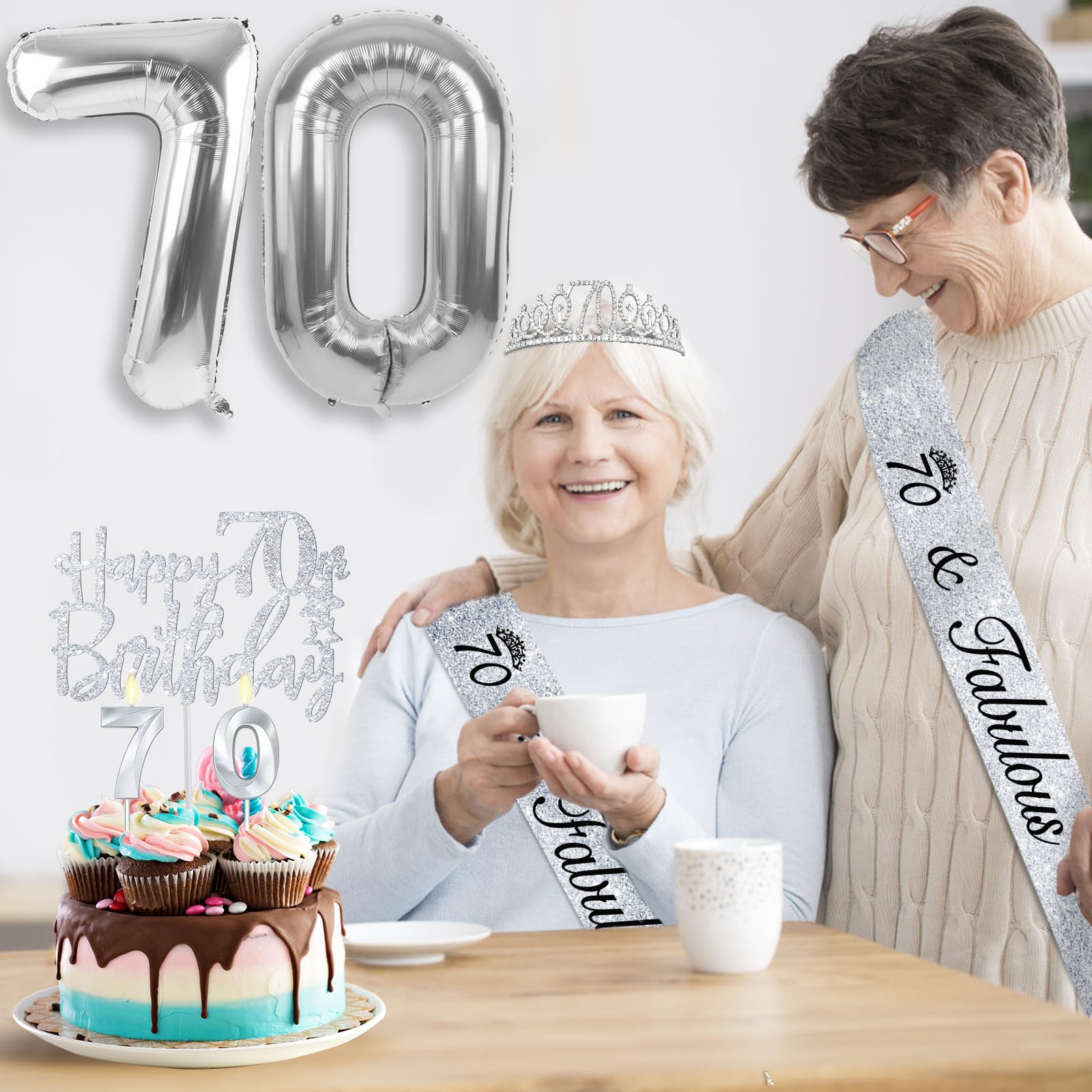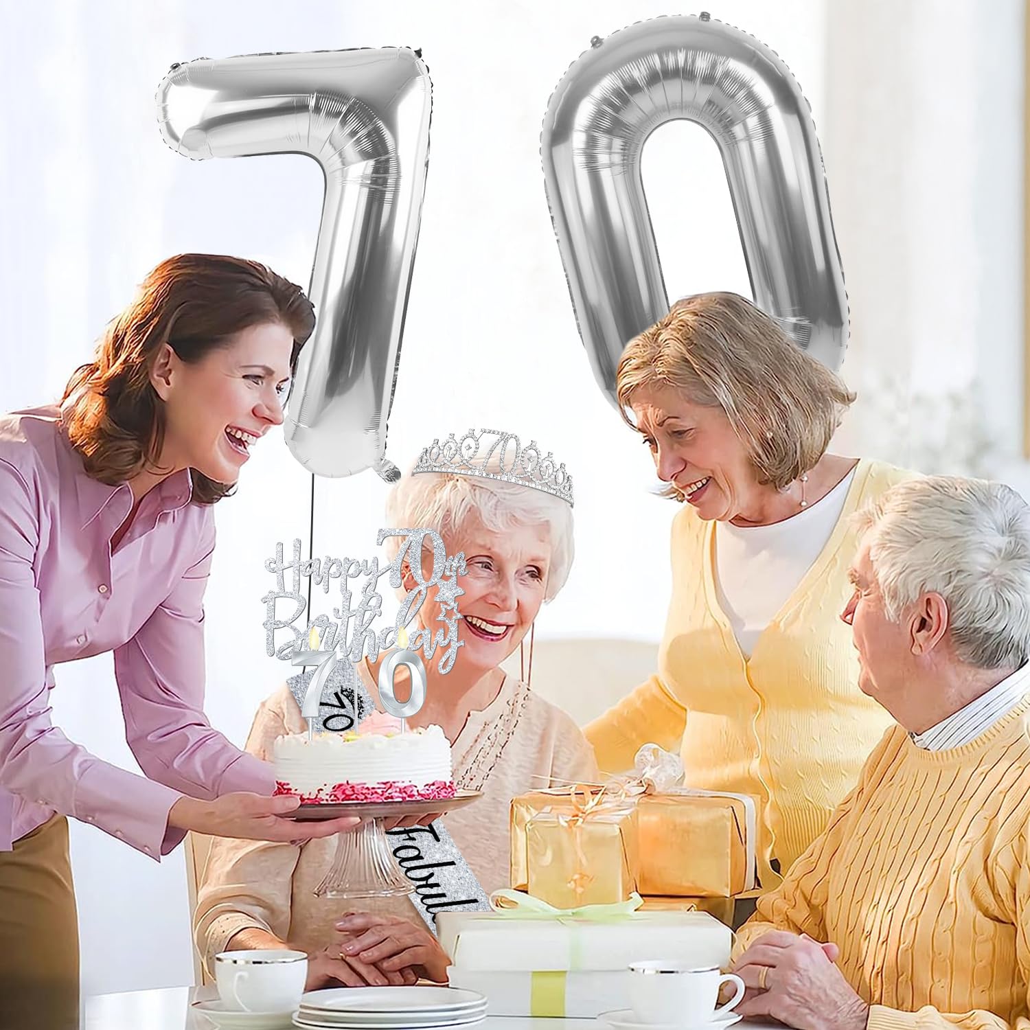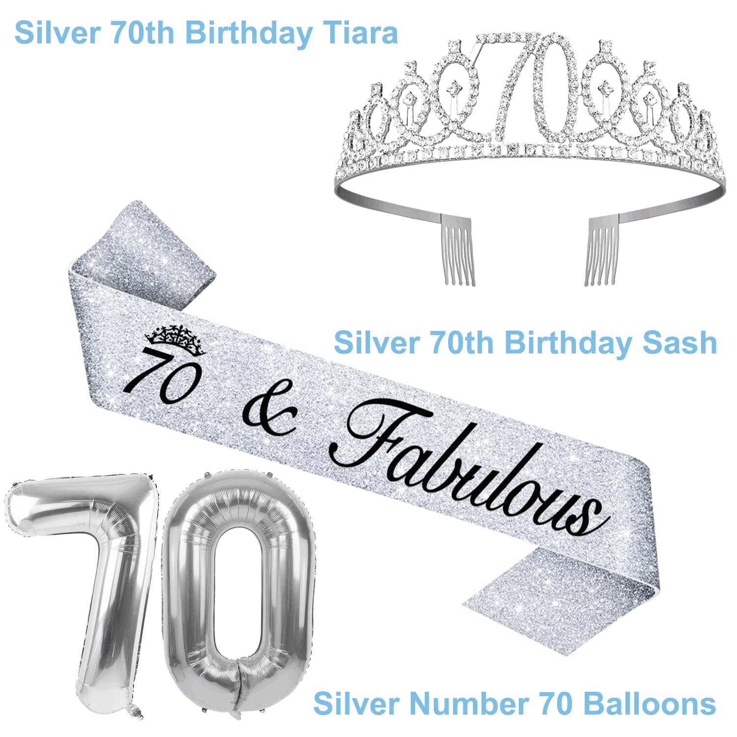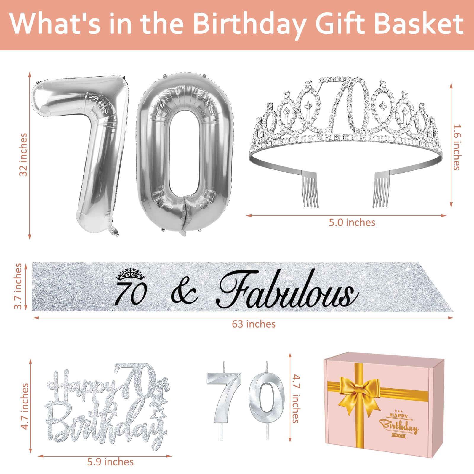 [70 Birthday Decorations Silver Set]: Package Coming with Glittery Rhinestone 70th Birthday Tiara/Crown x 1pc, Gold 70th Birthday Sash x 1pc, Happy 70th Birthday Cake Topper x 1pc, Number 70 Candles x 1set, Big Silver Numeral 70 Balloons x 1 set, Birthday Card x 1pc. This valuable 70th birthday gift for women gold has been packed in a beautiful gift box for ready presentation