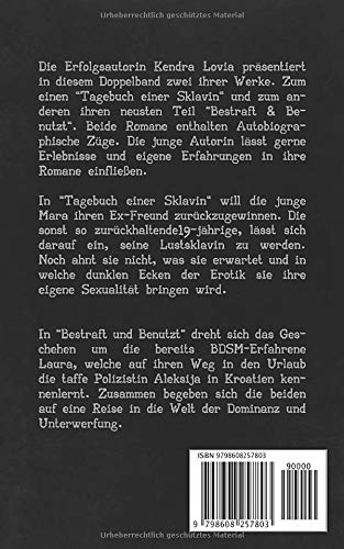 BDSM ROMANE "Tagebuch einer Sklavin" und "Bestraft & Benutzt" Sichern Sie sich 2 Teile für nur 9,99 € statt 14,99 €Ihre Vorteile im Überblick: ein Roman, welchen Sie nur auf Amazon erhalten! als Kindle Version & Taschenbuch erhältlich extrem schneller Versand & Geld-Zurück-Garantie da es sich hier um einen Amazon Prime Artikel handelt. Reduziert - statt 14,99€ nur 9,99€! Greifen Sie zu! Nur solange der Vorrat reicht! fairer Preis Die Erfolgsautorin Kendra Lovia präsentiert in diesem Doppelband zwei ihrer Werke. Zum einen “Tagebuch einer Sklavin“ und zum anderen ihren neusten Teil “Bestraft & Benutzt“. Beide Romane enthalten Autobiographische Züge. Die junge Autorin lässt gerne Erlebnisse und eigene Erfahrungen in ihre Romane einfließen. In “Tagebuch einer Sklavin“ will die junge Mara ihren Ex-Freund zurückzugewinnen. Die sonst so zurückhaltende19-jährige, lässt sich darauf ein, seine Lustsklavin zu werden. Noch ahnt sie nicht, was sie erwartet und in welche dunklen Ecken der Erotik sie ihre eigene Sexualität bringen wird. In “Bestraft und Benutzt“ dreht sich das Geschehen um die bereits BDSM-Erfahrene Laura, welche auf ihren Weg in den Urlaub die taffe Polizistin Aleksija in Kroatien kennenlernt. Zusammen begeben sich die beiden auf eine Reise in die Welt der Dominanz und Unterwerfung.