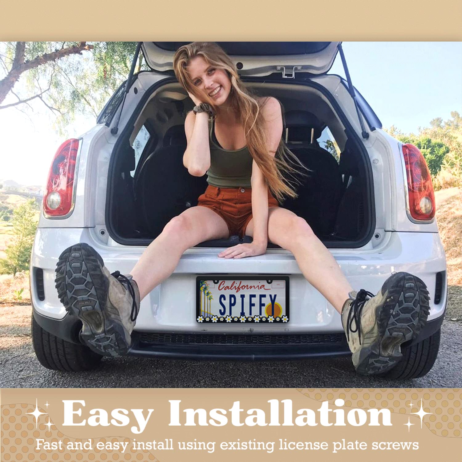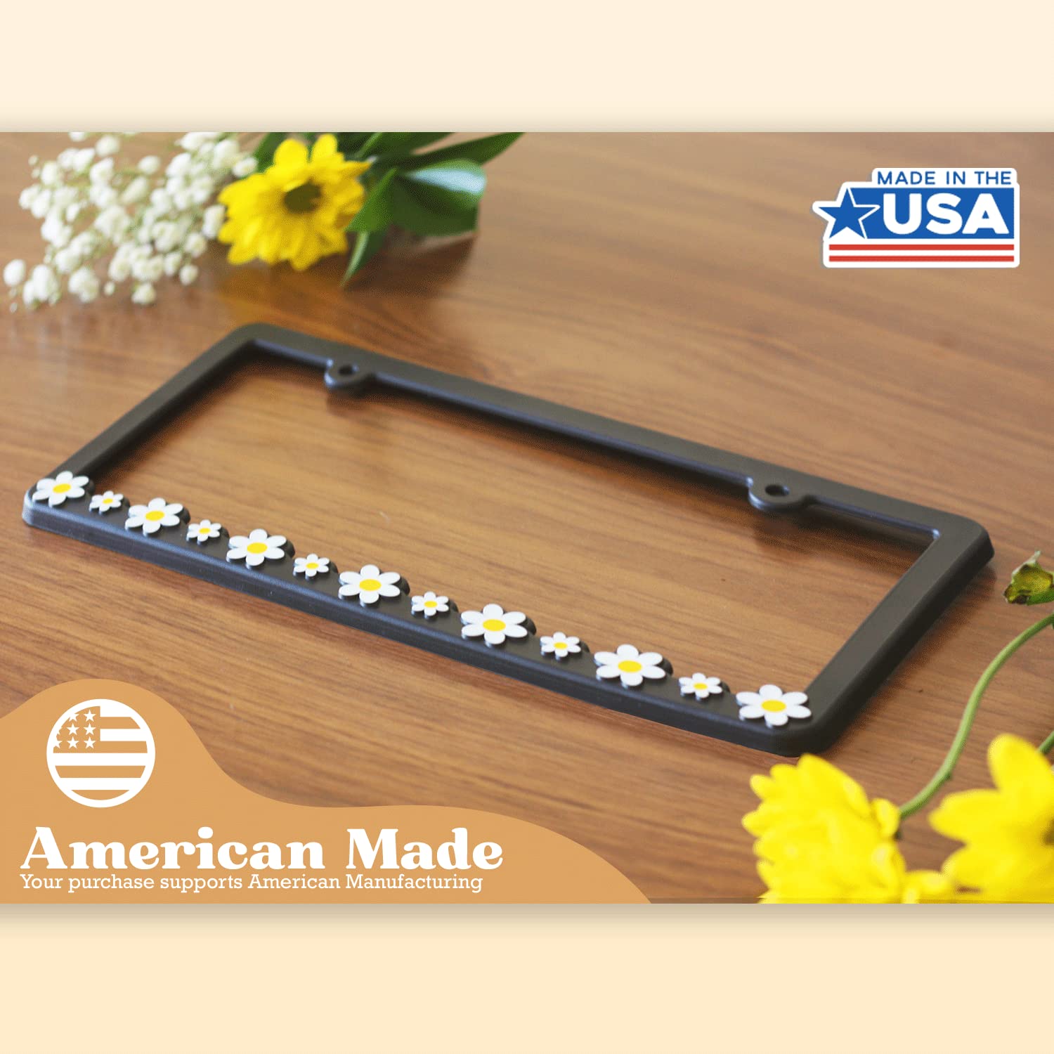 ✿MADE IN THE USA✿ At Spiffy, all our products are proudly made in America as part of our core principles. Our Daisy License Plate Frame reflects our commitment to high-quality craftsmanship and local production. By choosing our frame, you’re not only upgrading your car with unique girly decor but also supporting American Jobs and Values
