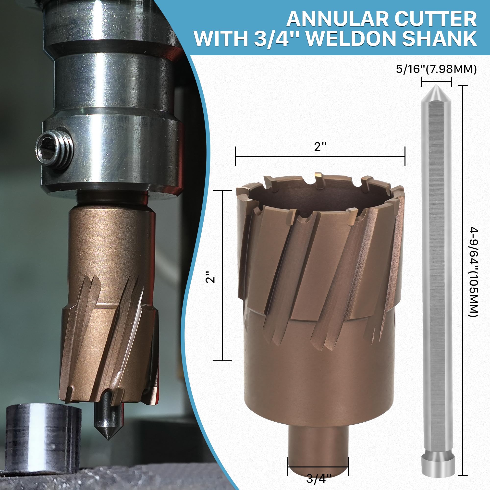 【Specifications】 - KEENTECH annular Cutter with features a premium carbide cutting edge for outstanding durability, making it ideal for drilling harder materials like stainless steel. It offers a 2" cutting diameter and a 2" cutting depth, and comes with a free pilot pin. The 3/4" weldon shank design is compatible with various magnetic drills, including but not limited to Alfra, Evolution, Dewalt, and Hougen.