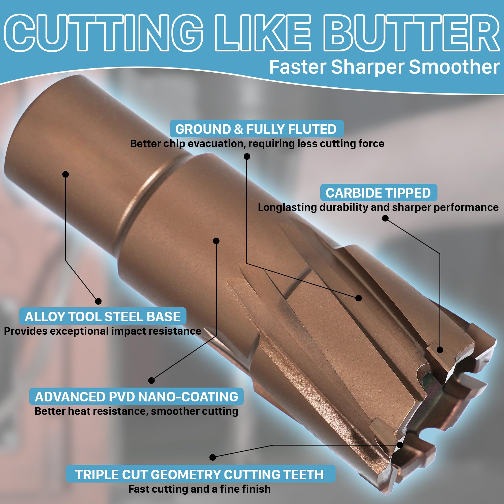 【Advanced PVD Nano-Coating】- Our annular drill bits, already exceptional, are further enhanced with a CrAlTiSiXN PVD nano-coating. This ultra-thin 3-micron layer reduces friction for smoother, faster cutting, increasing speed by 50% while maintaining a fine finish. The coating also significantly boosts wear and heat resistance, extending tool life by up to 10 times. Ideal for heavy-duty tasks, it handles greater loads, making it perfect for rough machining large workpieces.