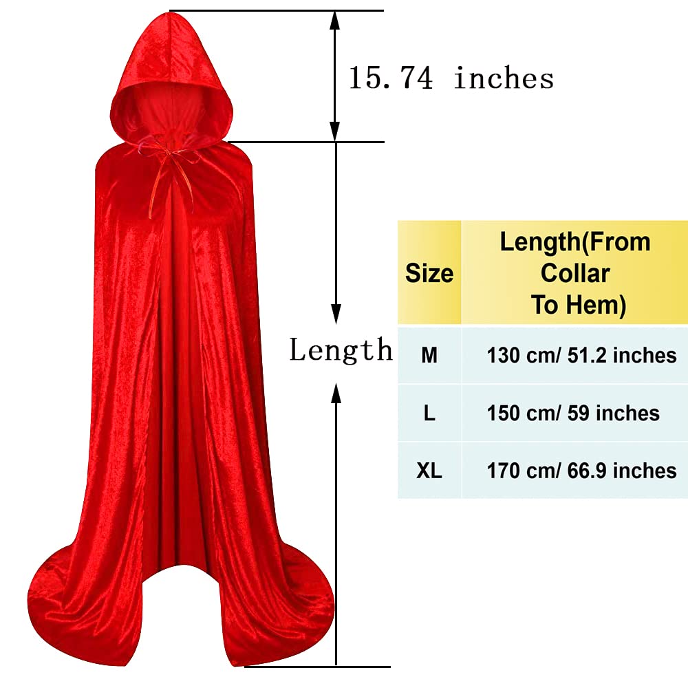 Description Tips: Please carefully check the size chart below before placing your order and choose the size that suits you. If you are unsure of the size, you can email us your height, we can help you choose the right size. In addition, all the clothes are measured by hand flat, please allow 1-2cm error, thank you for your understanding! Specifications: Size XL: Length 170cm /66.9 inches, fit For height 74.9-82.7inch / 190-210cm Size L: Length 150cm /59 inches, fit for height 66.9-74.9inch / 170-190cm Size M: Length 130cm /51.2 inches, fit for height 59.1-66.9inch / 150-170cm Package Included: 1 x Unisex Full Length Hooded Robe Cloak Long Velvet Cape Cosplay Costume