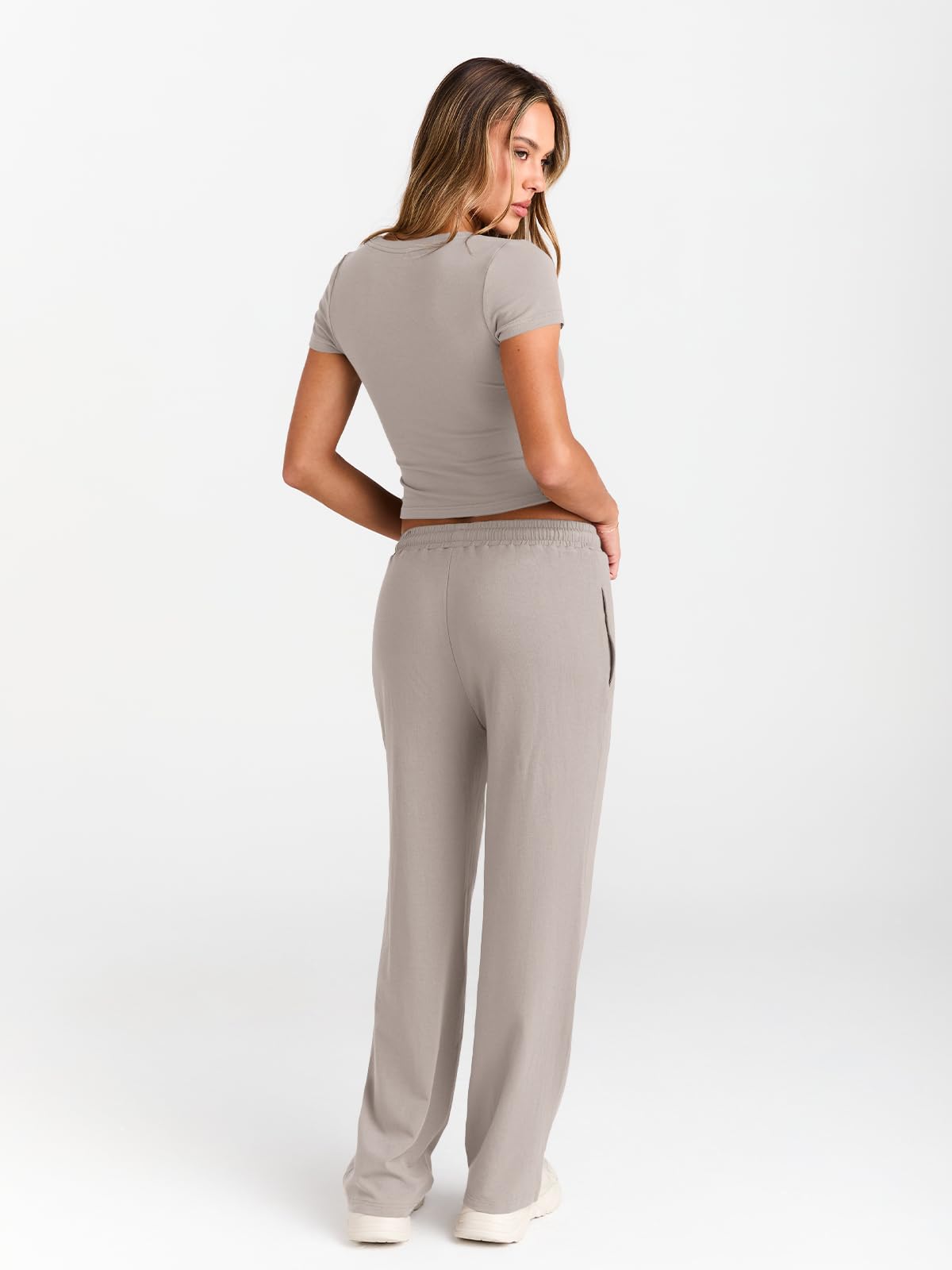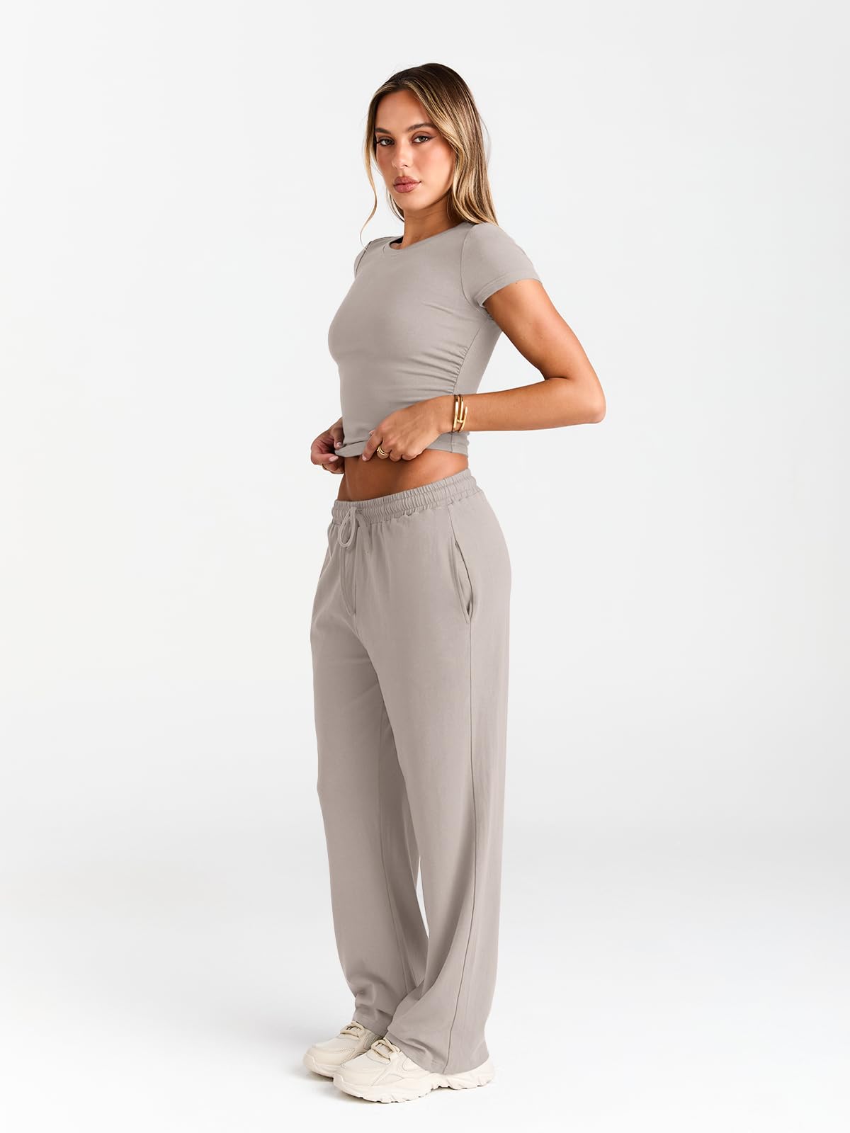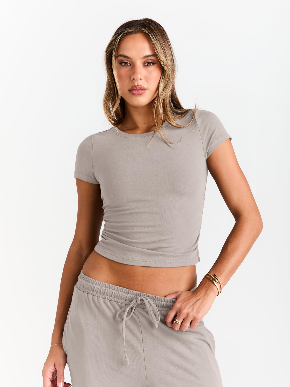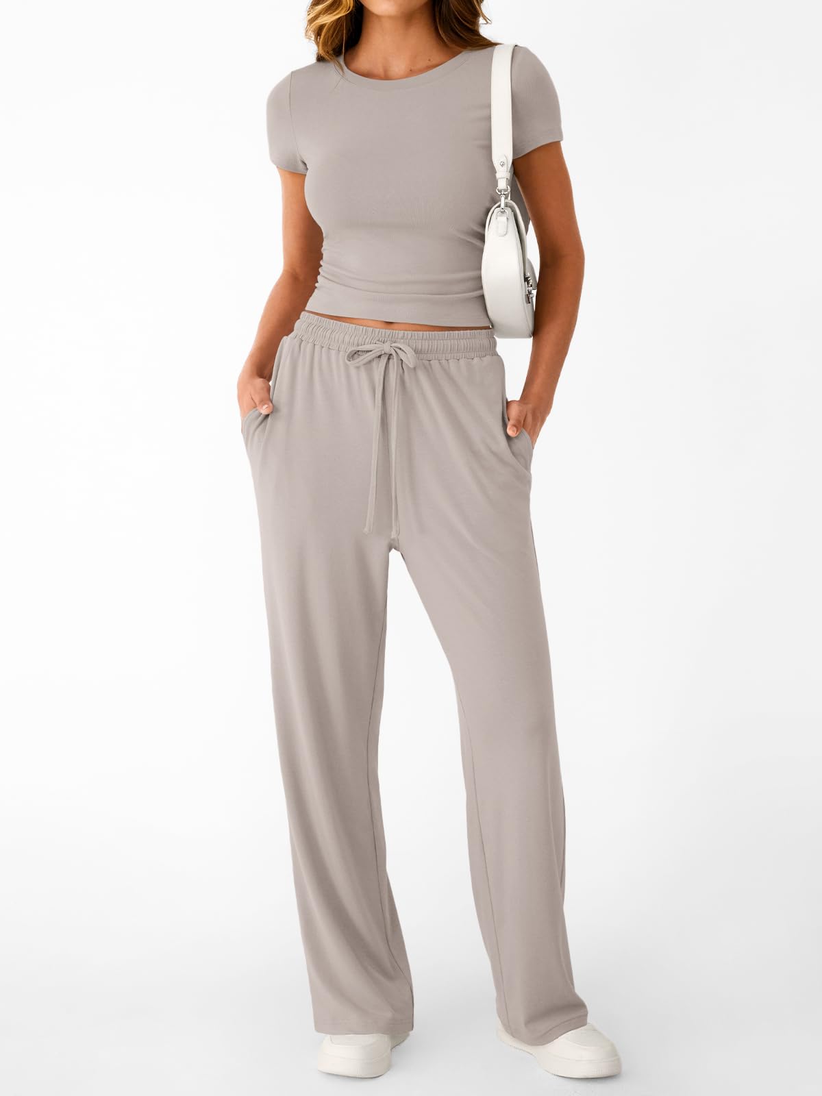 Confident & Practical Fit—Designed to elevate your everyday look. The short-sleeve top features delicate side ruching for a feminine touch, with a modestly cropped hem that hits just right to flatter your waistline. The flowy wide-leg pants complete the outfit with an adjustable drawstring waist and convenient side pockets—perfect for carrying essentials hands-free. Together, they create a chic, customizable silhouette that celebrates every body type with both style and everyday function.
