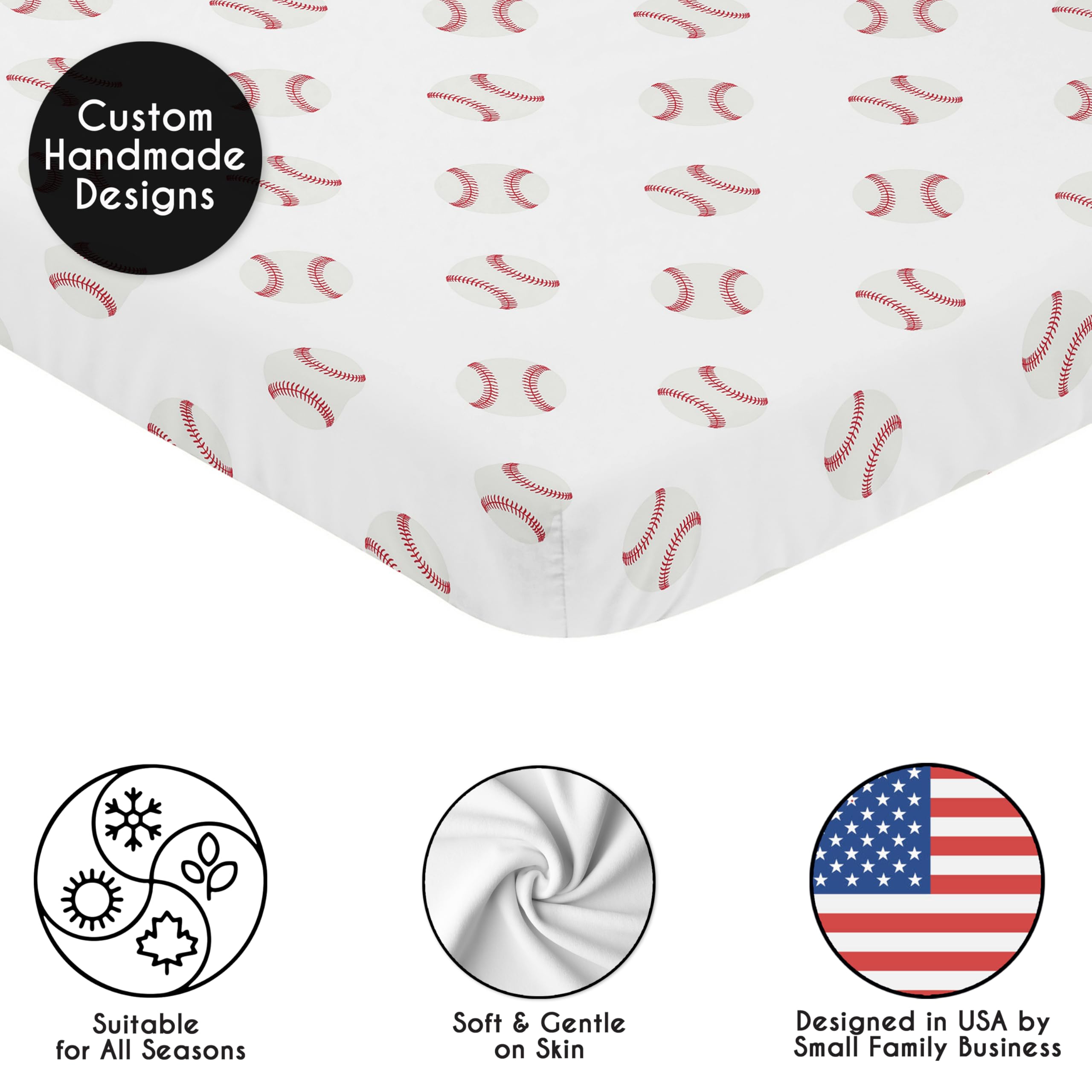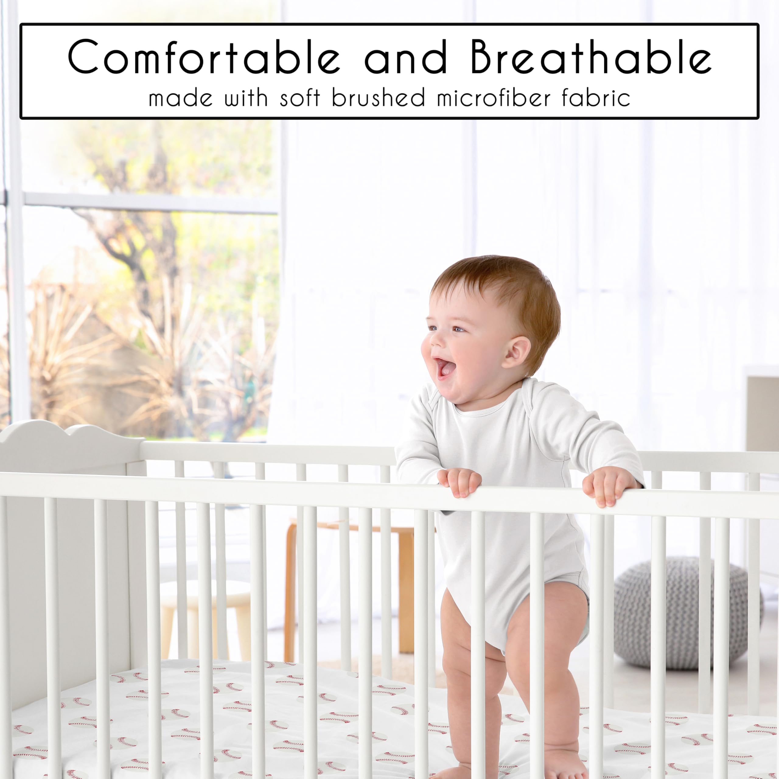 SNUG FIT: Includes (1) Mini Crib Mattress Sheet 24in. x 38in. x 5in. Our newborn mini crib sheets fit snugly, with premium elastic sewn around the entire bottom edge for a secure fit on most smaller size cribs, play yards, & portable cribs to reduce shifting & bunching. This brushed microfiber pack and play sheet features an exclusive design of a red & white sports balls, Americana athletic, classic base balls, sport baseballs print & is gentle on delicate skin. WILL NOT FIT STANDARD SIZE CRIBS.