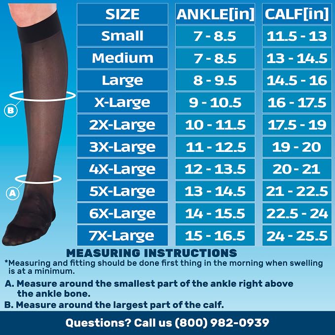 DETAILED SIZE CHART - Comprehensive size chart factoring in both calf and ankle measurements for a perfect fit.