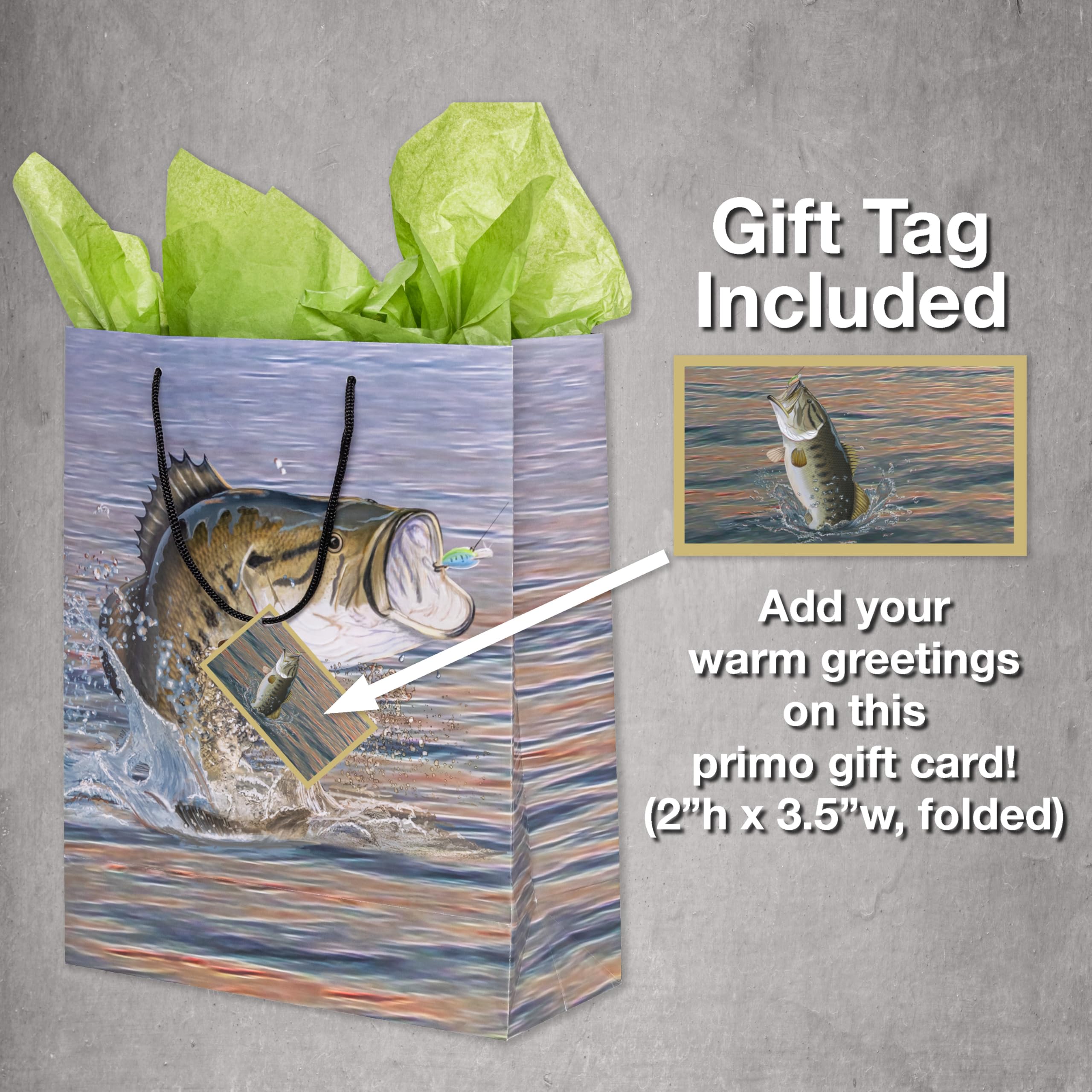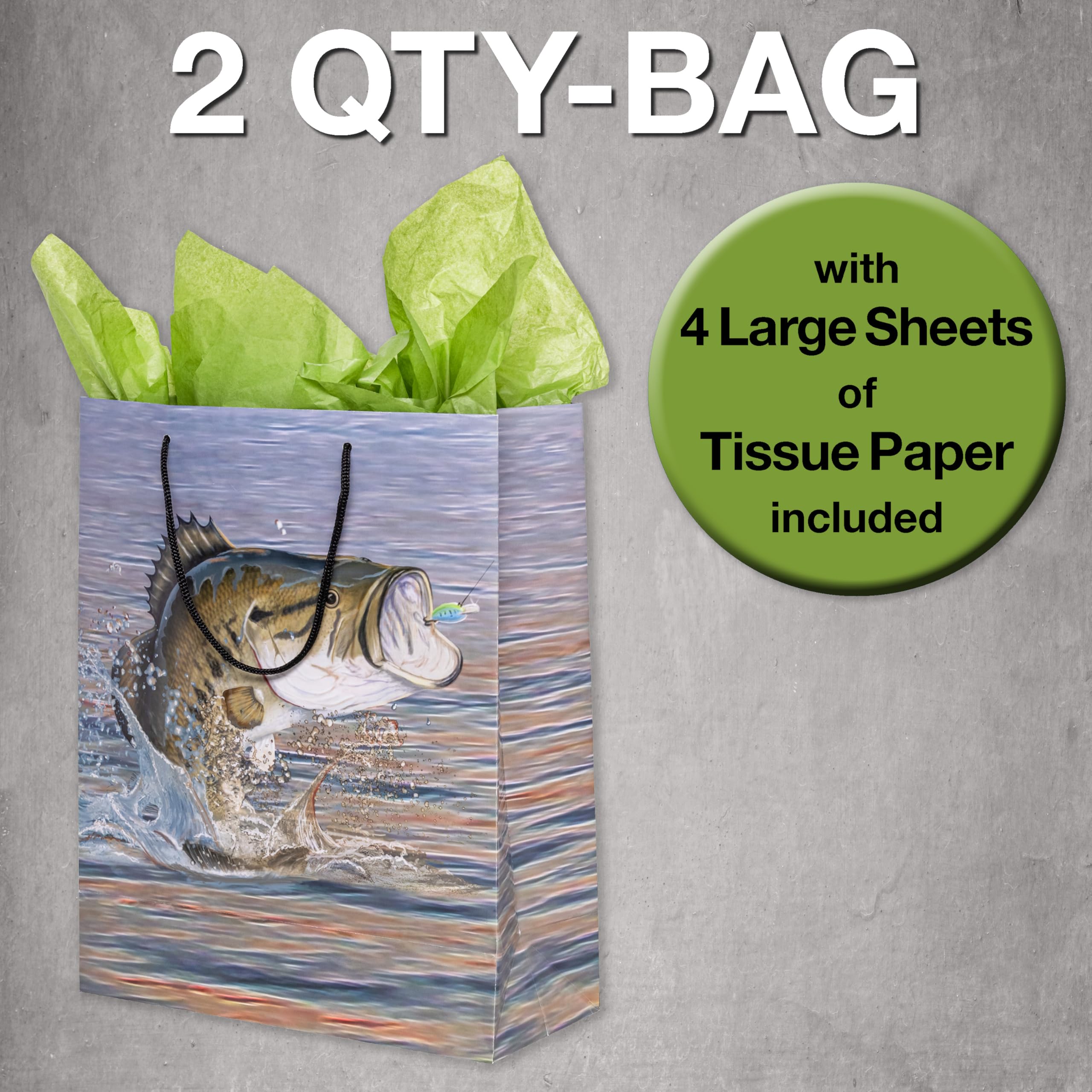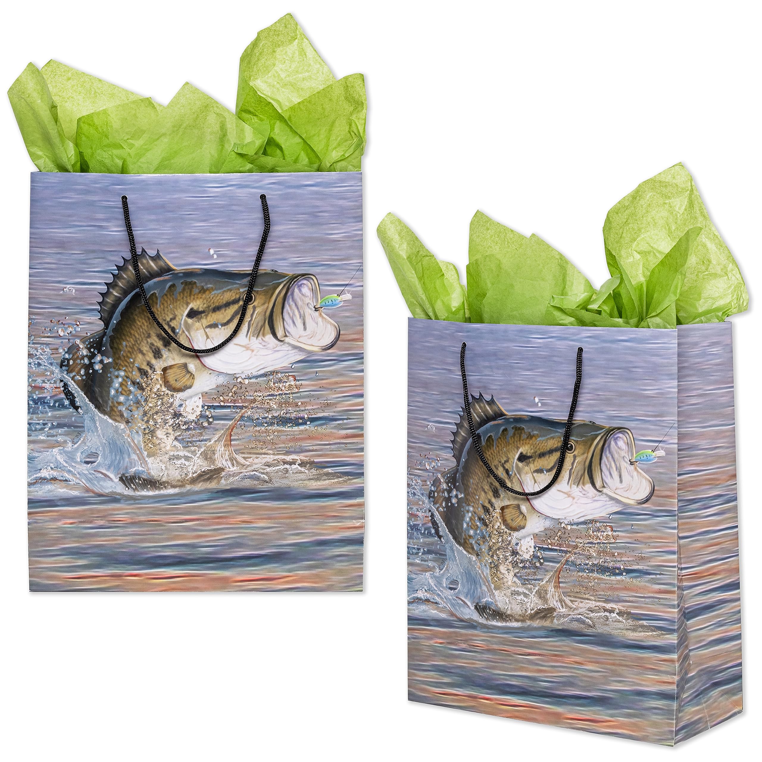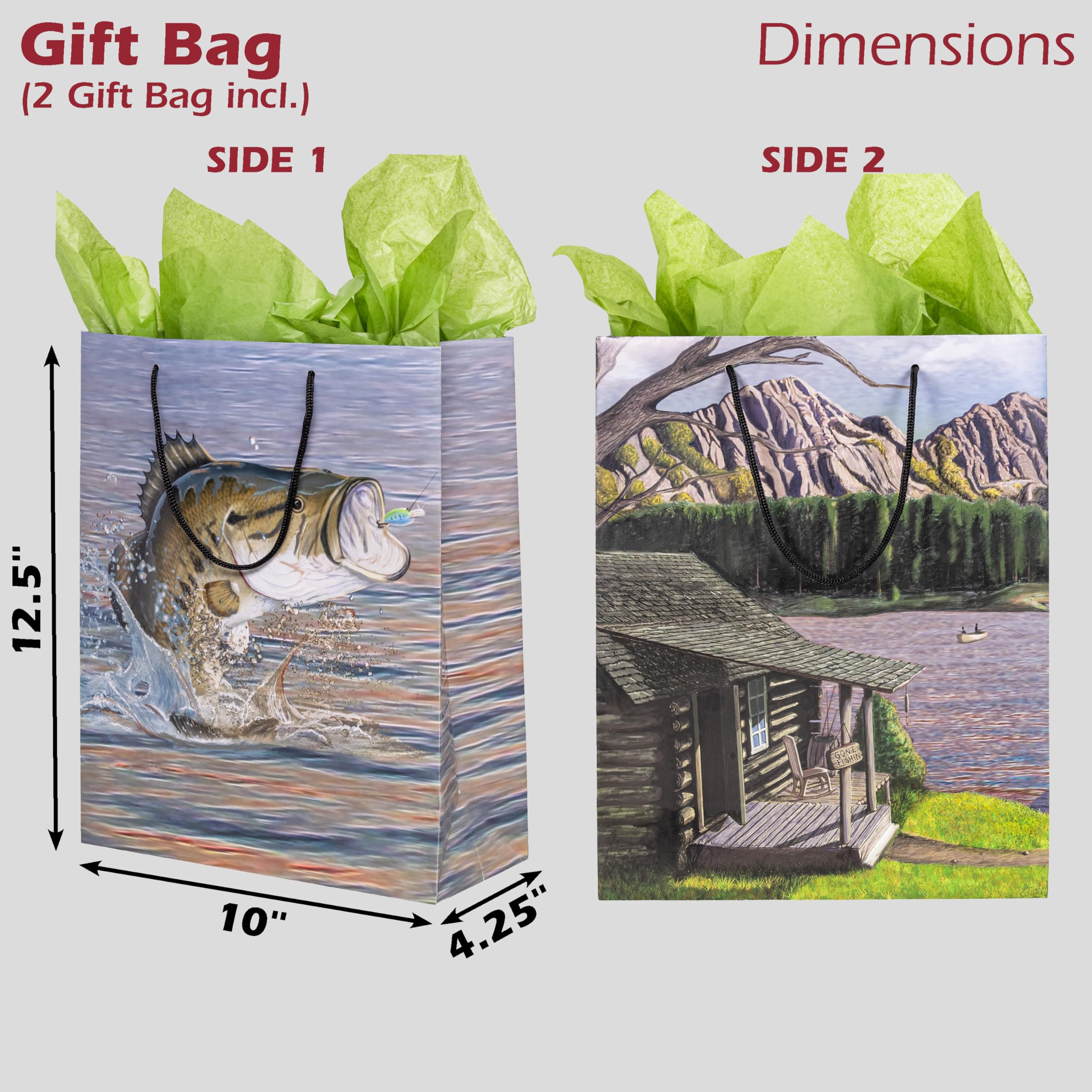 2 Beautiful Gift Bags in Fishing Theme. Includes tissue with each bag. Perfect for Father's Day, Retirement, and Birthday Gift! Great for a Fishing Party, any Gift, Wrap for a Present, Giftwrap, Gift bag, Gift wrap, Giftbag, Gift bags, presents, Fish theme party, retirement or party for dad. Bag measures 10 inch Wide by 12 inch High by 4.25 inch Deep.