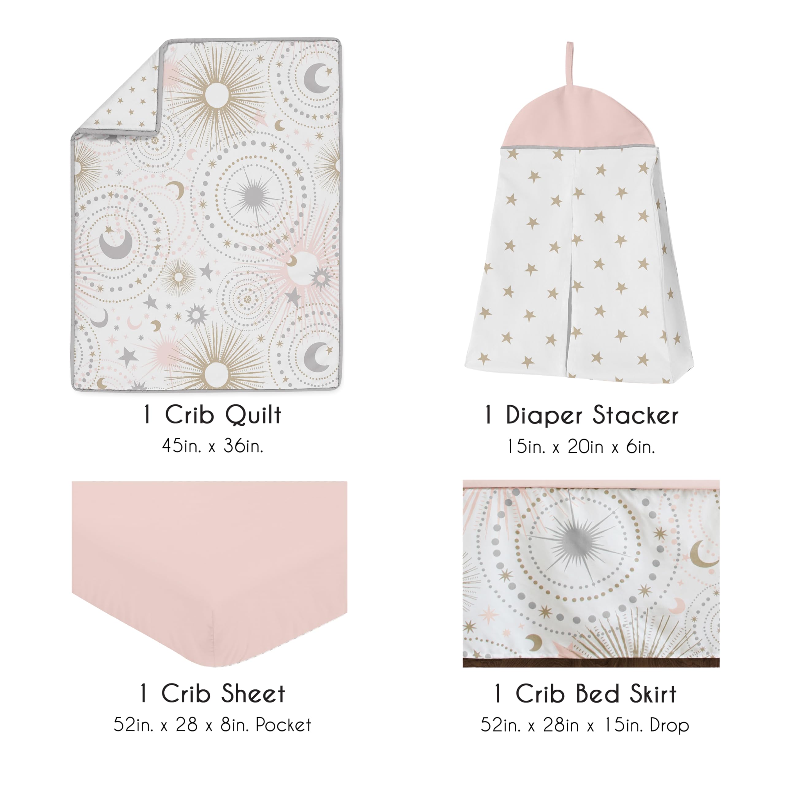 4 PIECE CRIB BEDDING SET INCLUDES: Crib Comforter (45in. x 36in.), Fitted Crib Sheet (52in. x 28in. x 8in. Pocket), Crib Skirt (52in. x 28in. x 15in. Drop) and Diaper stacker (15in. x 20in. x 6in.). An infant crib set including all the baby essentials is a great value compared to purchasing pieces separately. This baby crib set is made of soft microfiber fabrics and features the girly color palette of blush pink, gold and grey to bring your celestial sky, shabby boho chic baby room together.