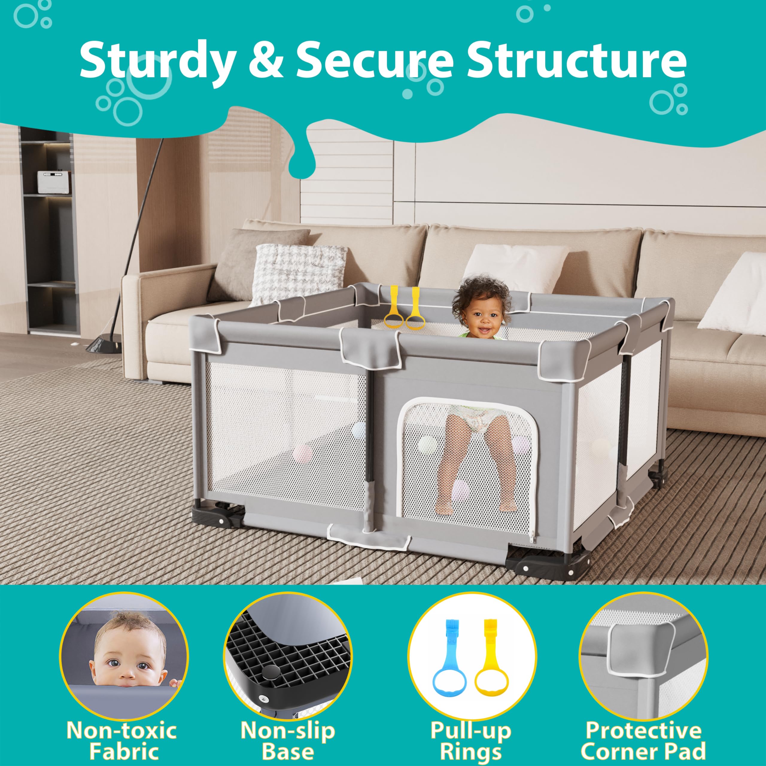 Free Parents' Hands: The ICAREWAY baby play pen foldable offers a generous space for your little ones to explore, play, and practice independent movement while ensuring their safety from potential hazards. With two pull-up rings and an ergonomically designed height(27"), this playpen aids your babies in learning to stand and walk, giving parents the freedom to tackle their own tasks or enjoy a well-deserved break