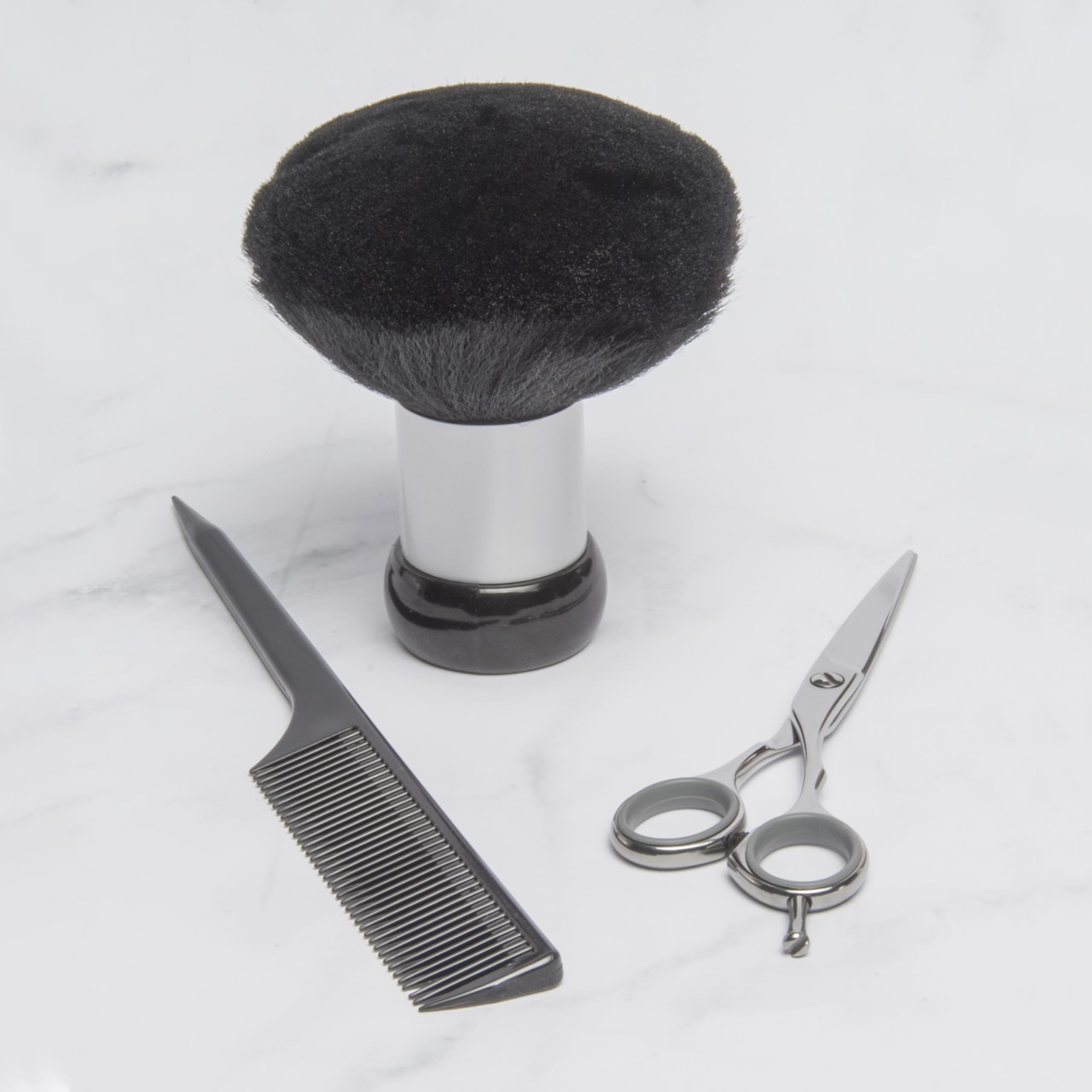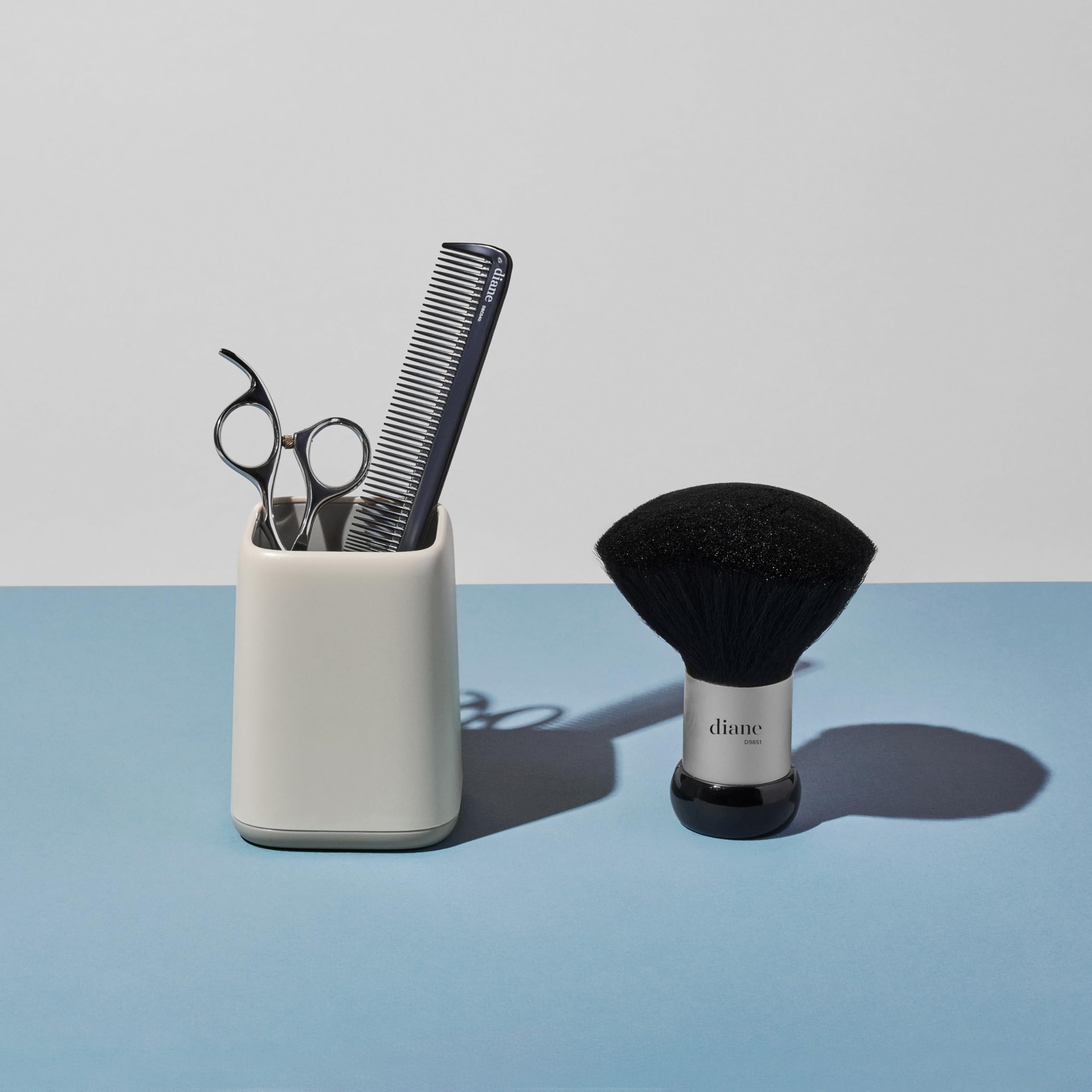 The Diane Neck Duster brush works great for brushing off hair around the neckline and ears after a haircut. The soft nylon bristles are gentle on skin, and the handle is ergonomically designed for a comfortable grip. The stand-up base is easy to use in any salon or barber station. It also makes a great tool and accessory for at home use with men’s, women’s, and kids’ hair cutting. It features a black and silver plastic handle and the medium size measures 5 inches long.