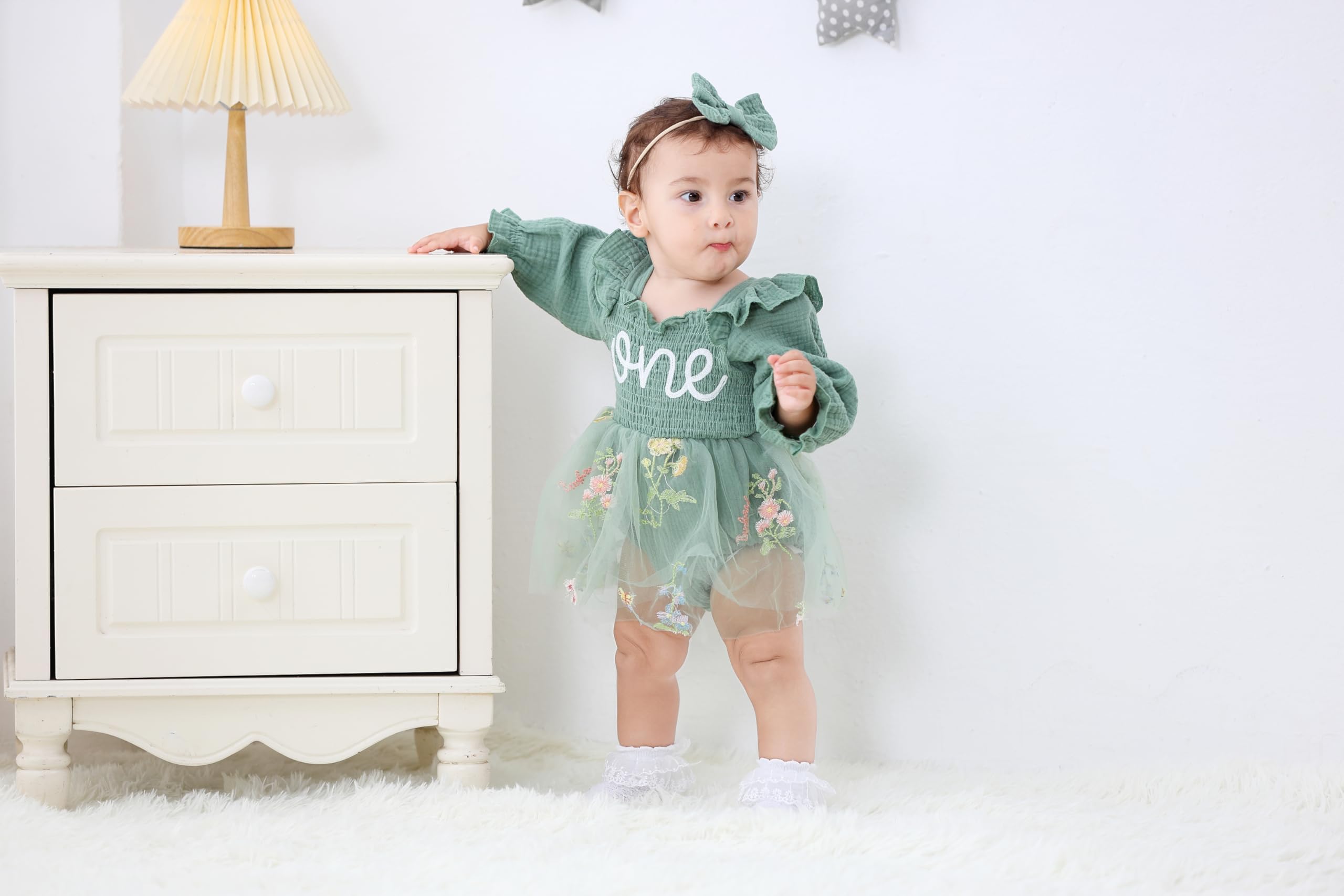 Design: Newborn baby girl playwear romper dress with long sleeve, solid color, multi-layered tulle, Snap leg openings for easy diaper changes, easier morning for novice mother.Cute princess 1st birthday outfit, fashionable and adorable embroidery ONE printed themed birthday clothes perfect for creating beautiful memory of her first birthday.