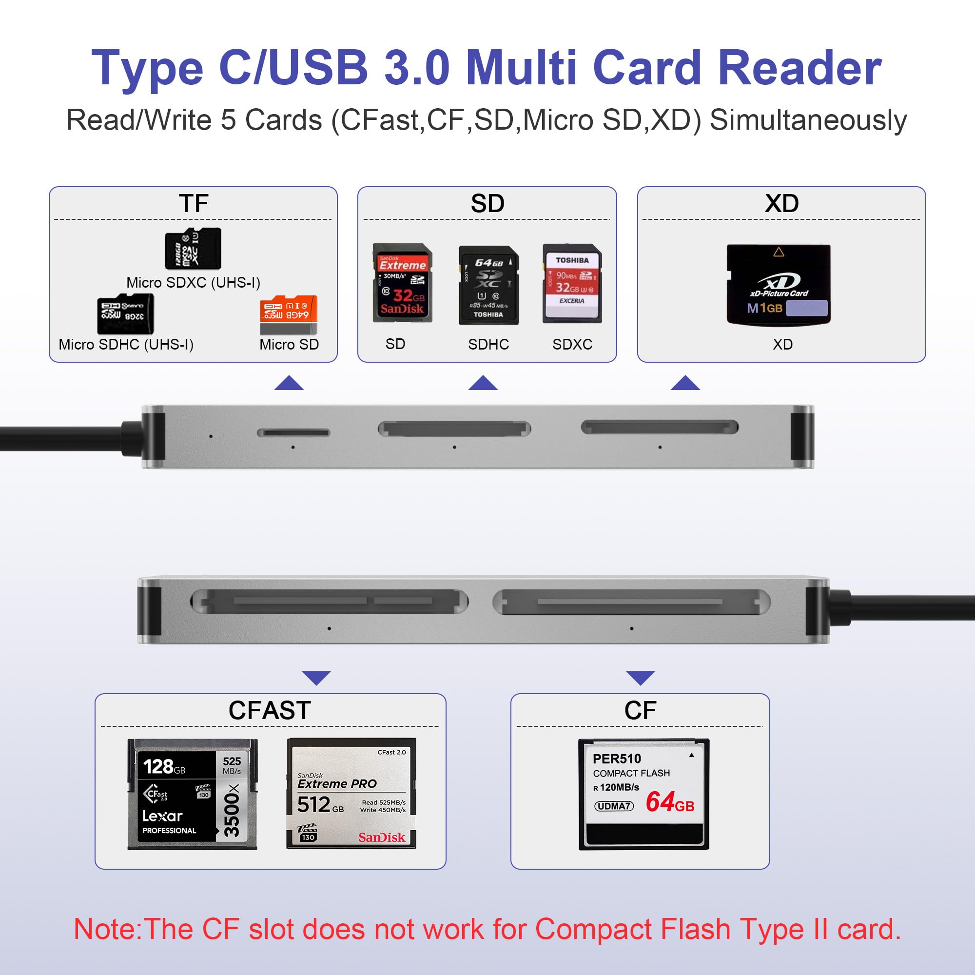 【Card compatibity】CFast 2.0 reader built-in 5 card slots: CFast, CF(Compact Flash), SD, TF and XD card slots, Supports CFast, CF, SDXC, SDHC, SD, XD, CF(Compact Flash), Micro SDXC, Micro SDHC, Micro SD cards [support CF-I cards]