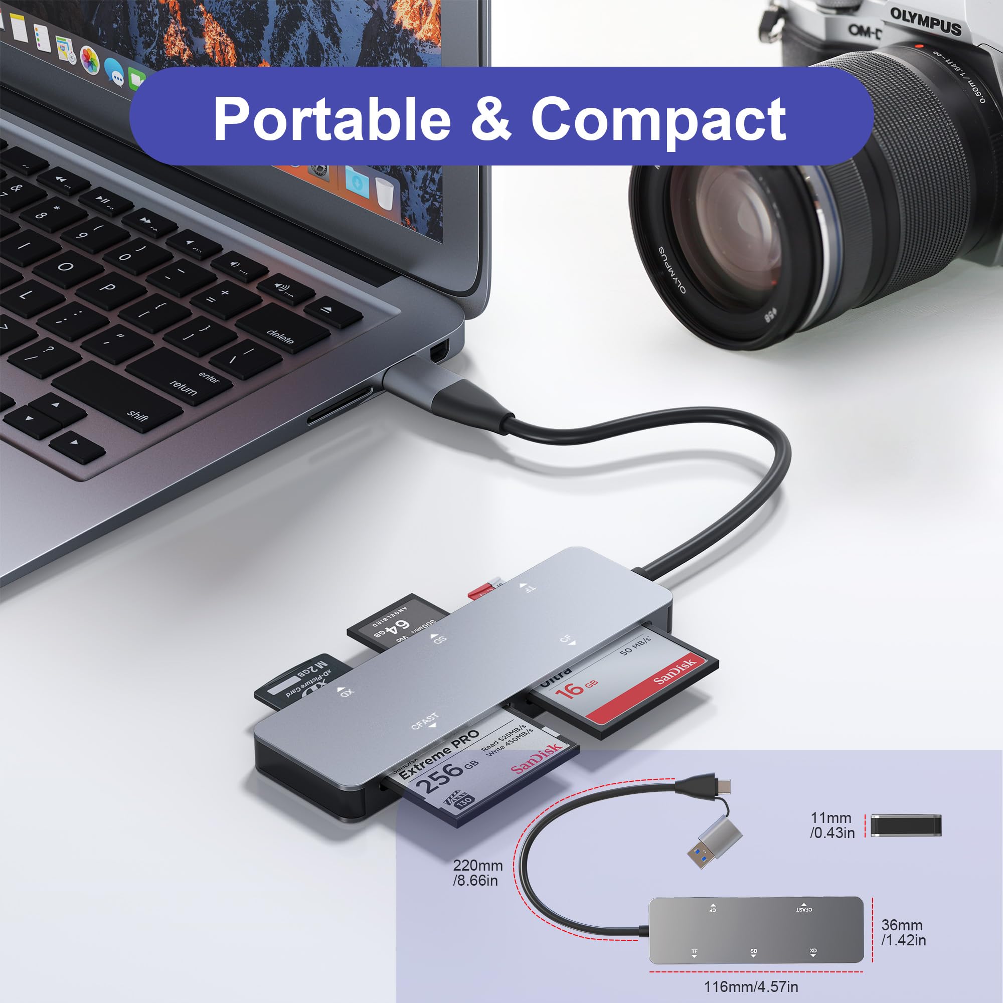 【Aluminum Compact Design】This USB C CFast Card Reader with a compact portable design could save space and easy take. The aluminum alloy cover makes the CFast reader more durable and high quality.