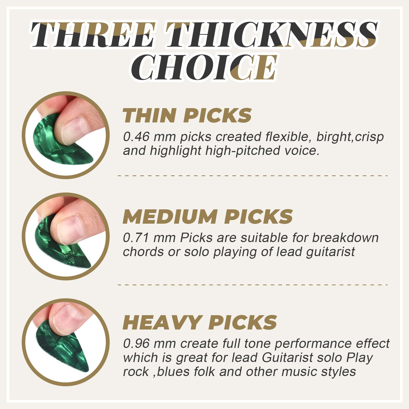 Different Thicknesses: guitar picks come with three different thicknesses, there are three thicknesses of 0.46 mm, 0.71 mm and 0.96 mm respectively; Different thicknesses have different playing sounds