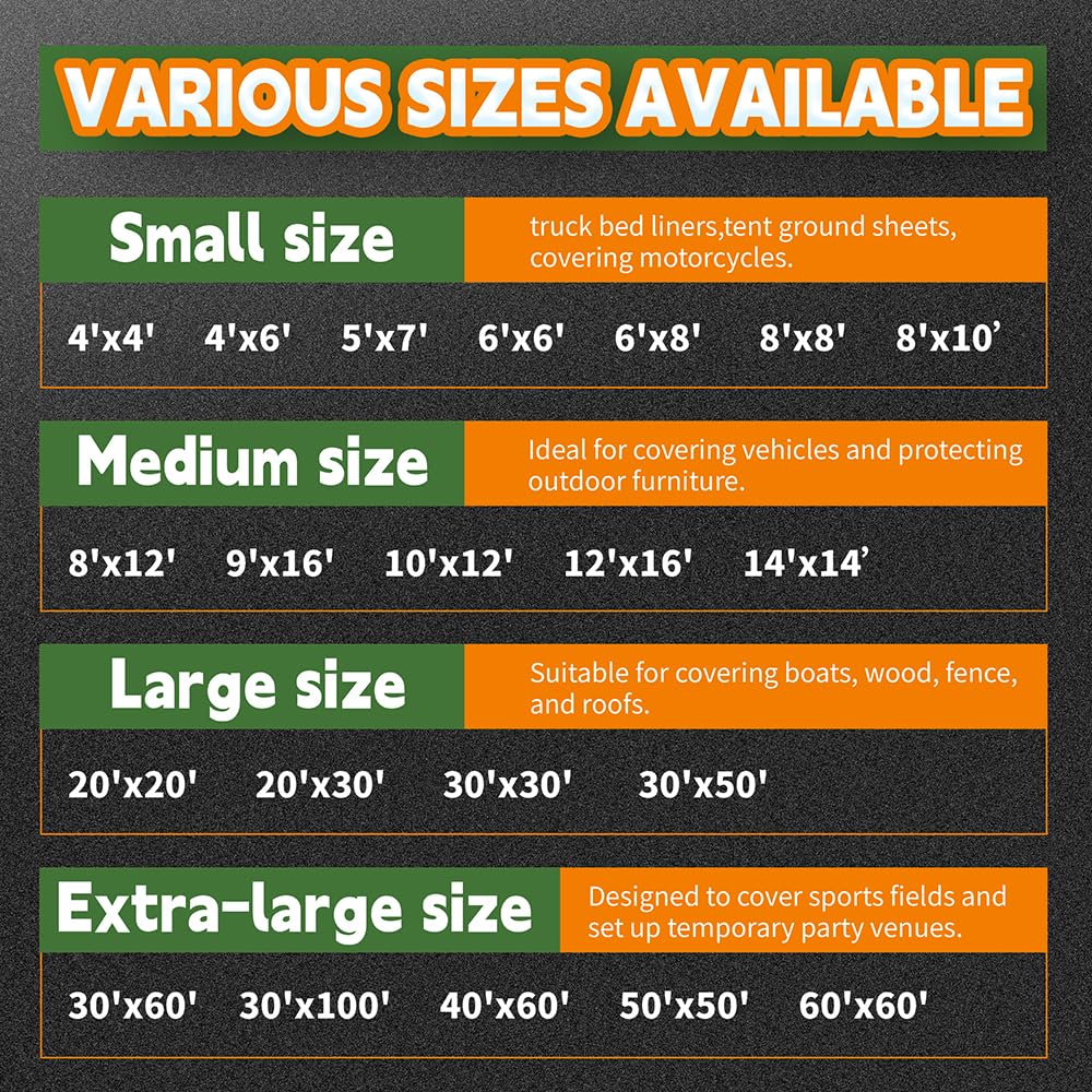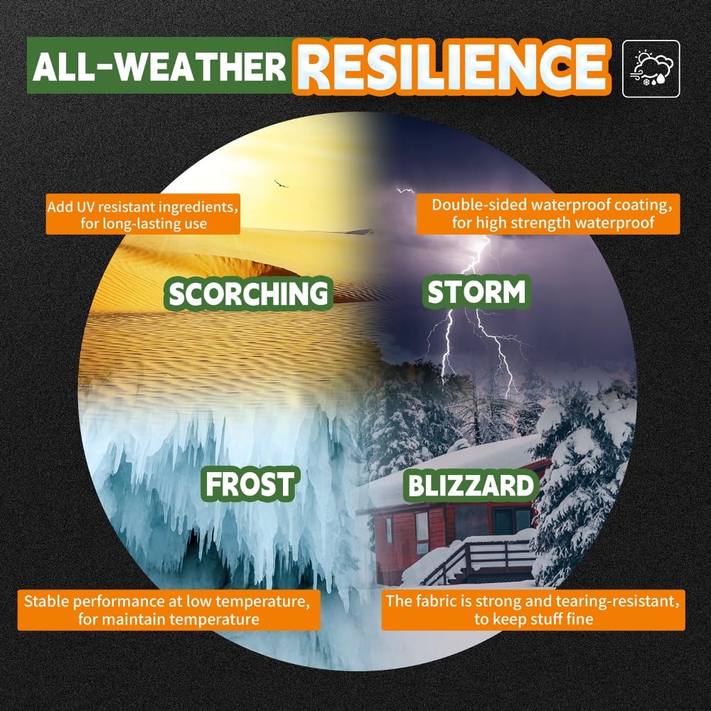 【UV RESISTANT TARP + WEATHER PROOF】Our tarp is designed to withstand outdoor use for extended periods due to UV anti-aging additives in the material. With a double-sided LDPE coating, it offers excellent water resistance. Count on us to be prepared for unpredictable