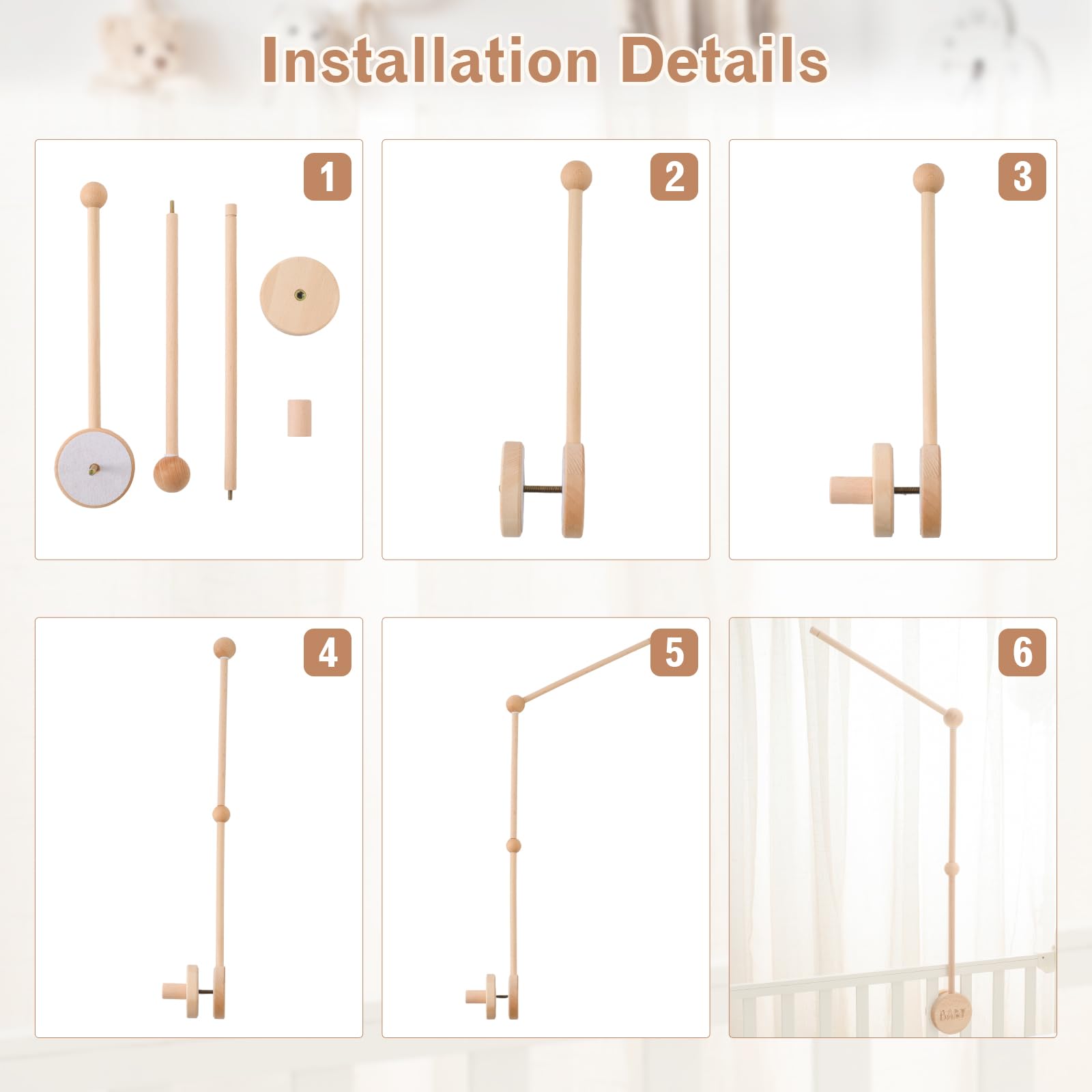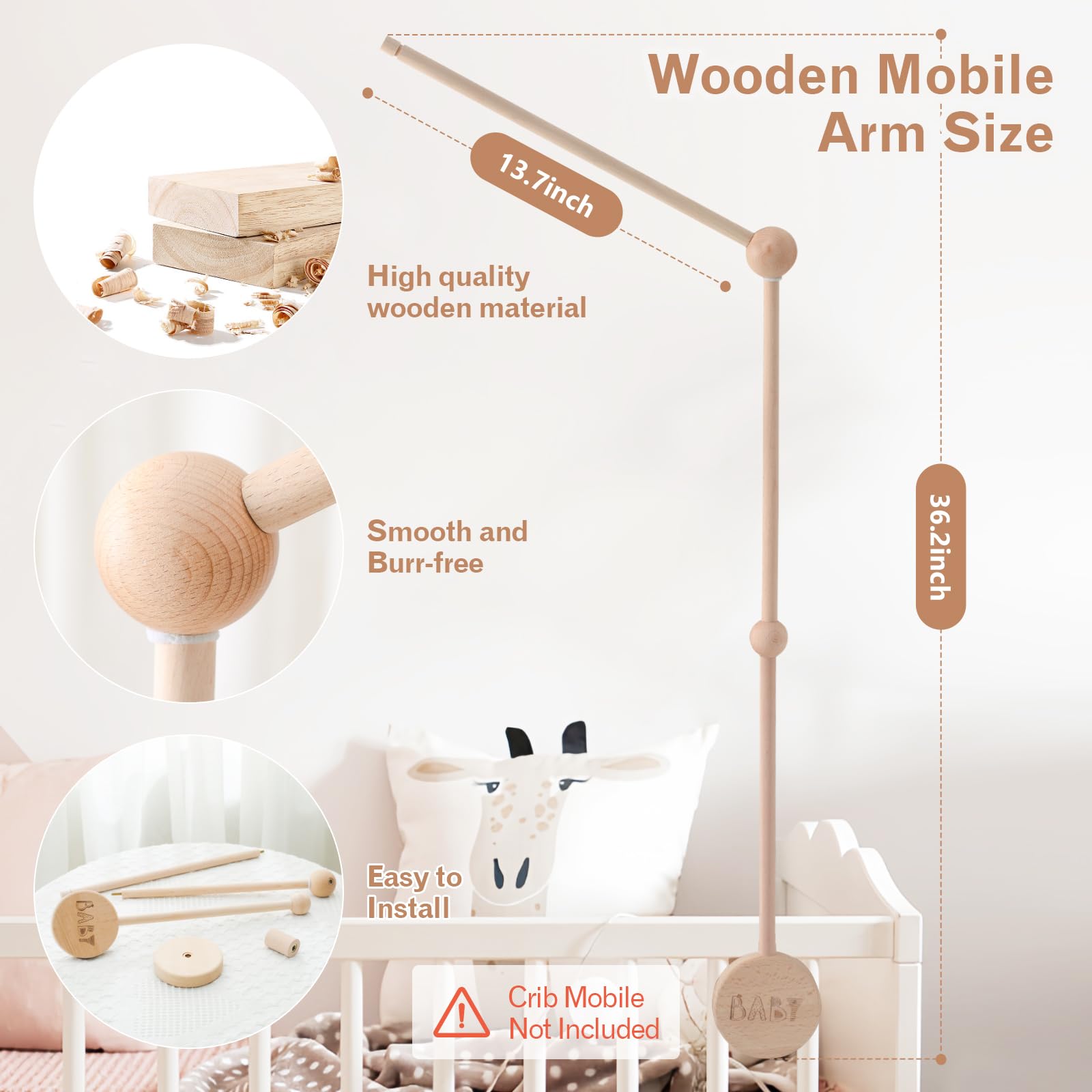 👶🏻【Safe Material】JETM·HH baby mobile arm is made of 100% natural beech wood, which is non-toxic and burr-free. The smooth surface can protect the baby's soft and fragile skin. The mobile device of the crib has an anti-slip design and is enlarged. The design can better adapt to various cribs and be more firmly fixed on the crib