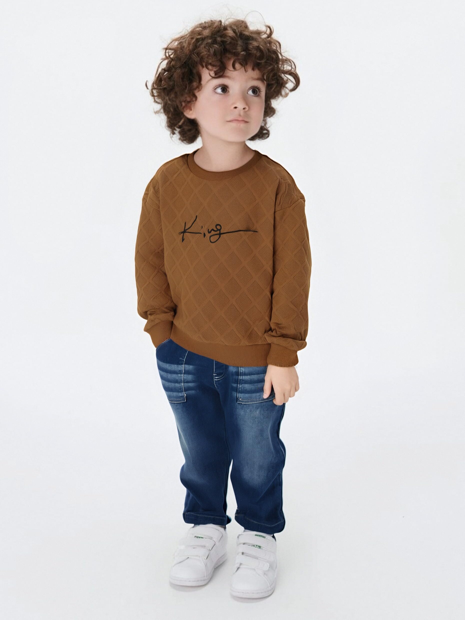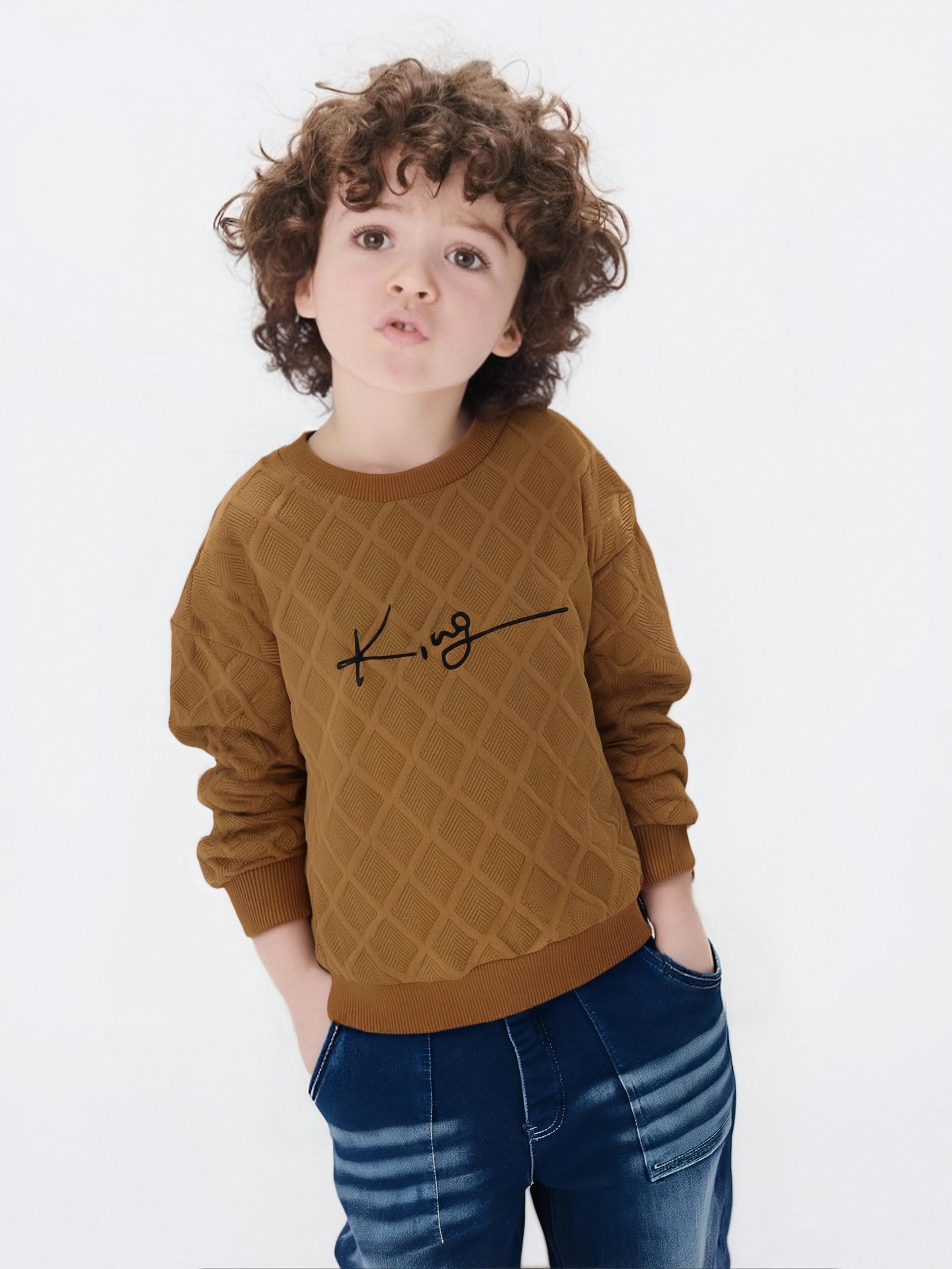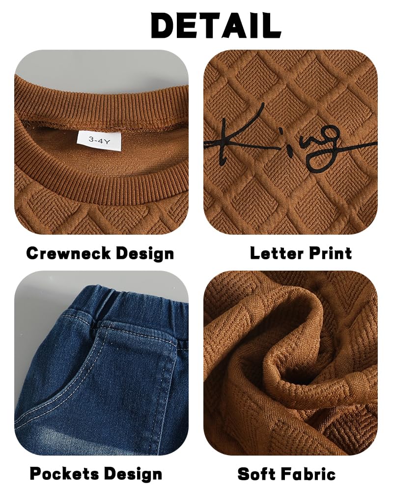 Stylish Design: The pullover sweatshirt features a cozy quilted pattern with eye-catching βKINGβ lettering on the chest, giving your little one a cool, confident look. Ideal for toddler outfits for boys who love bold, playful styles