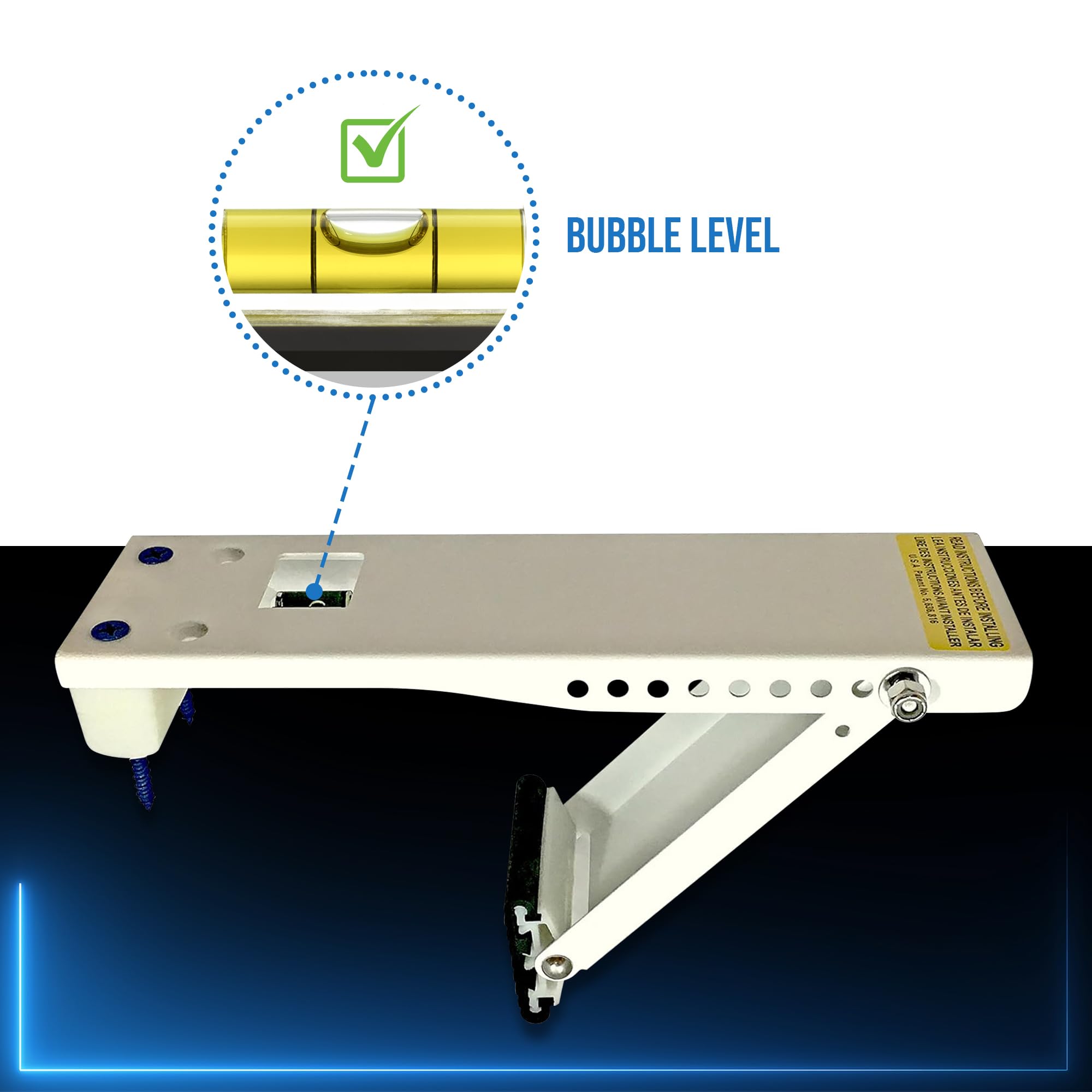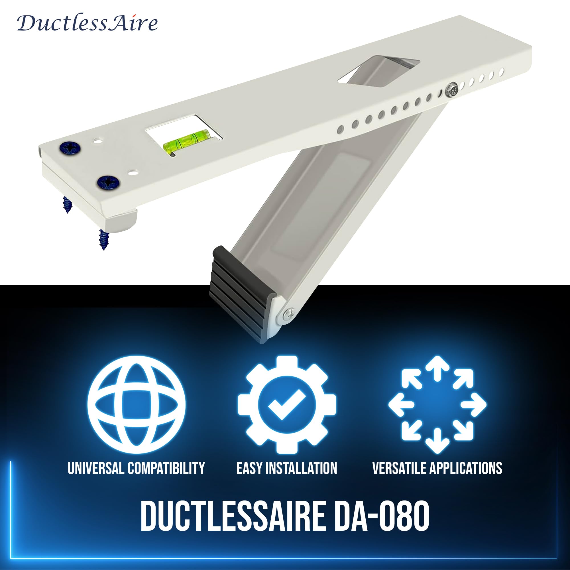 VERSATILE ADJUSTABILITY FOR FLEXIBLE USE: The DuctlessAire DA-080 air conditioner support bracket offers adjustable mounting features, making it suitable for various HVAC systems. This versatile ac window bracket supports window AC units, condensers, disconnect switches, and more. The integrated bubble level ensures precise installation. This adjustable design makes the window AC support bracket essential for custom setups, ensuring secure, aligned mounting for optimal efficiency.