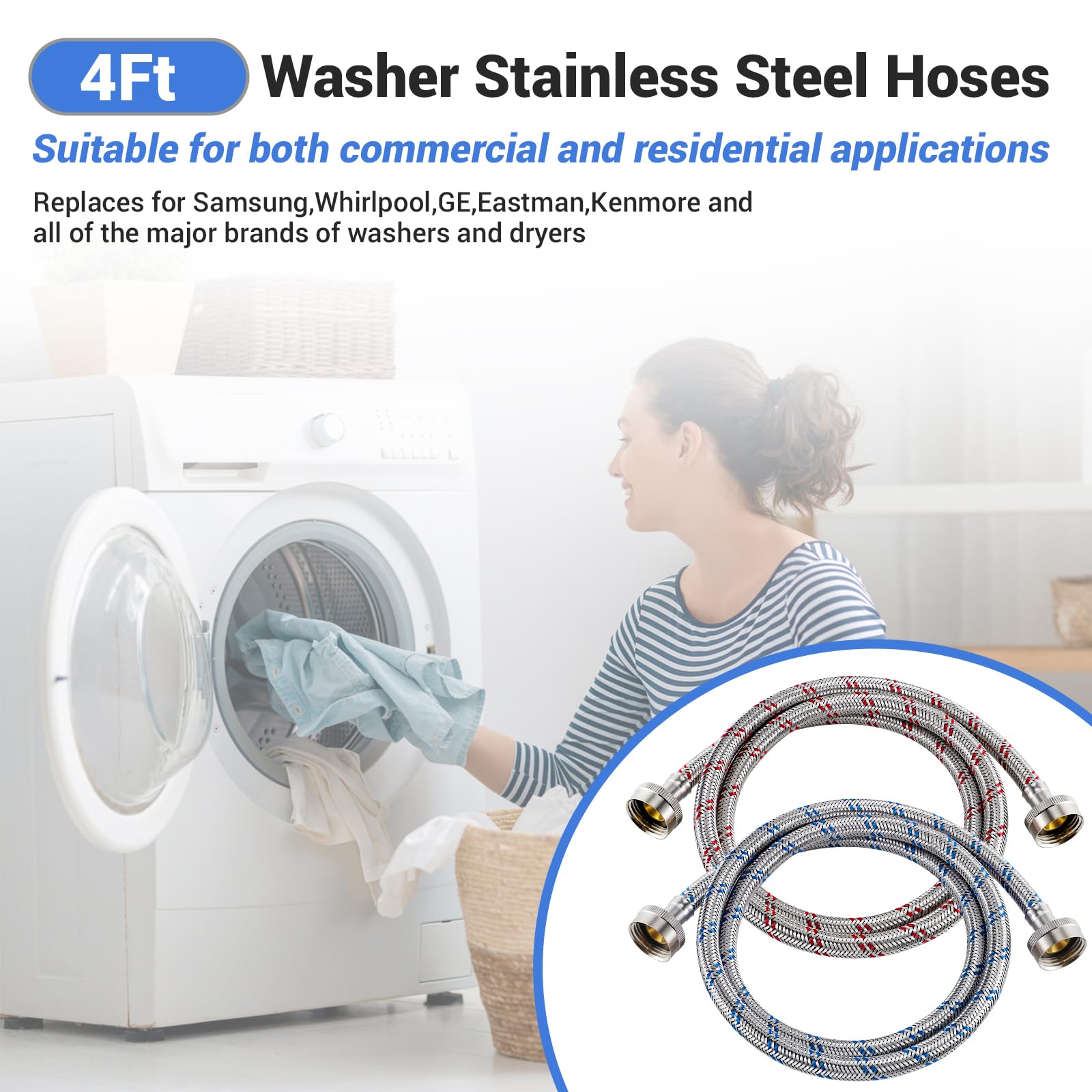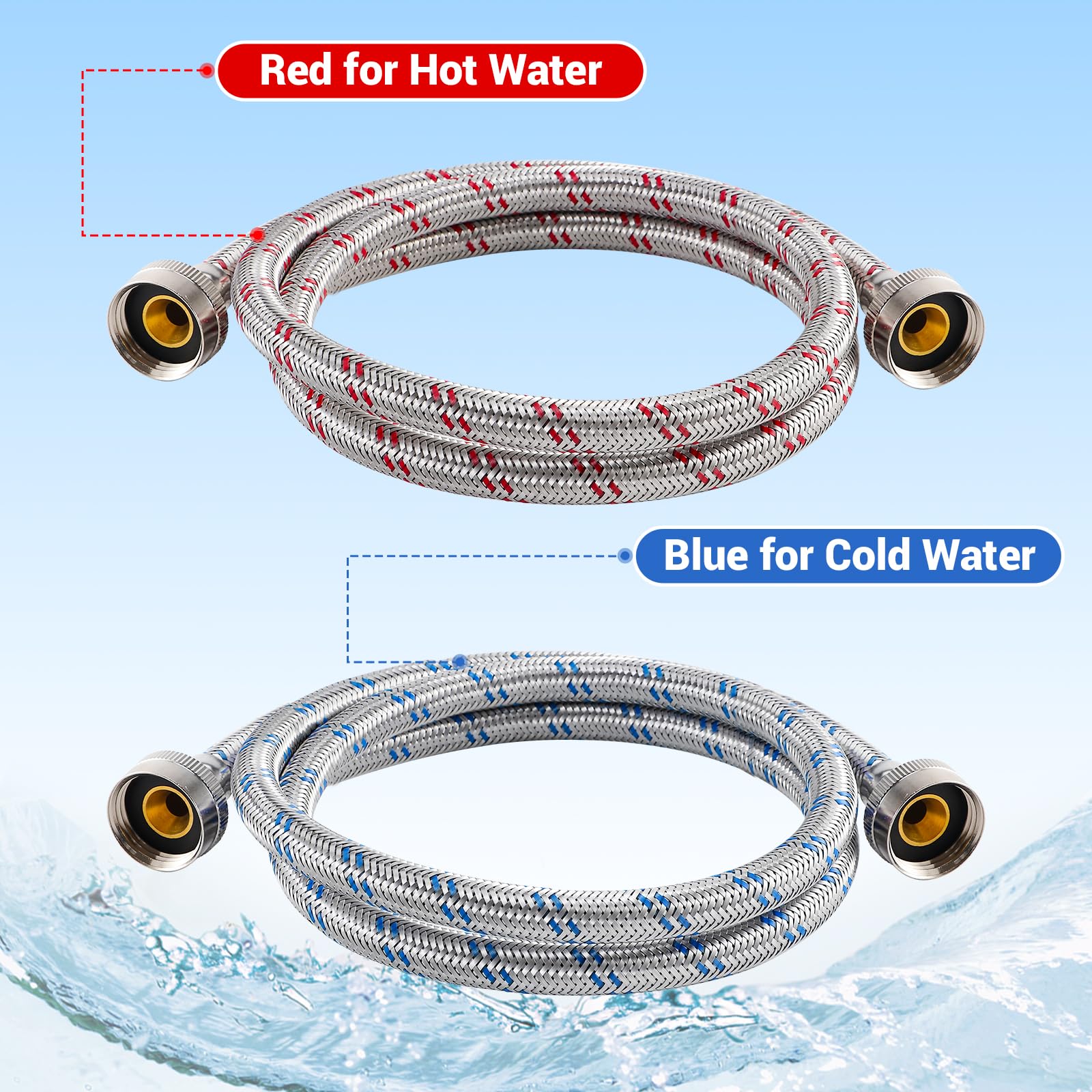 【PACKAGE INCLUDES】: 1 x Red colored washer hoses for hot water, 1 x Blue colored washer hoses for cold Water. Our stainless steel washing machine hoses with two-layer PVC core and brass nut has excellent corrosion resistance, which can effectively prevent rusting and cracking for a long time. Thickened rubber gasket creates a better seal at each connection point to prevent leakage