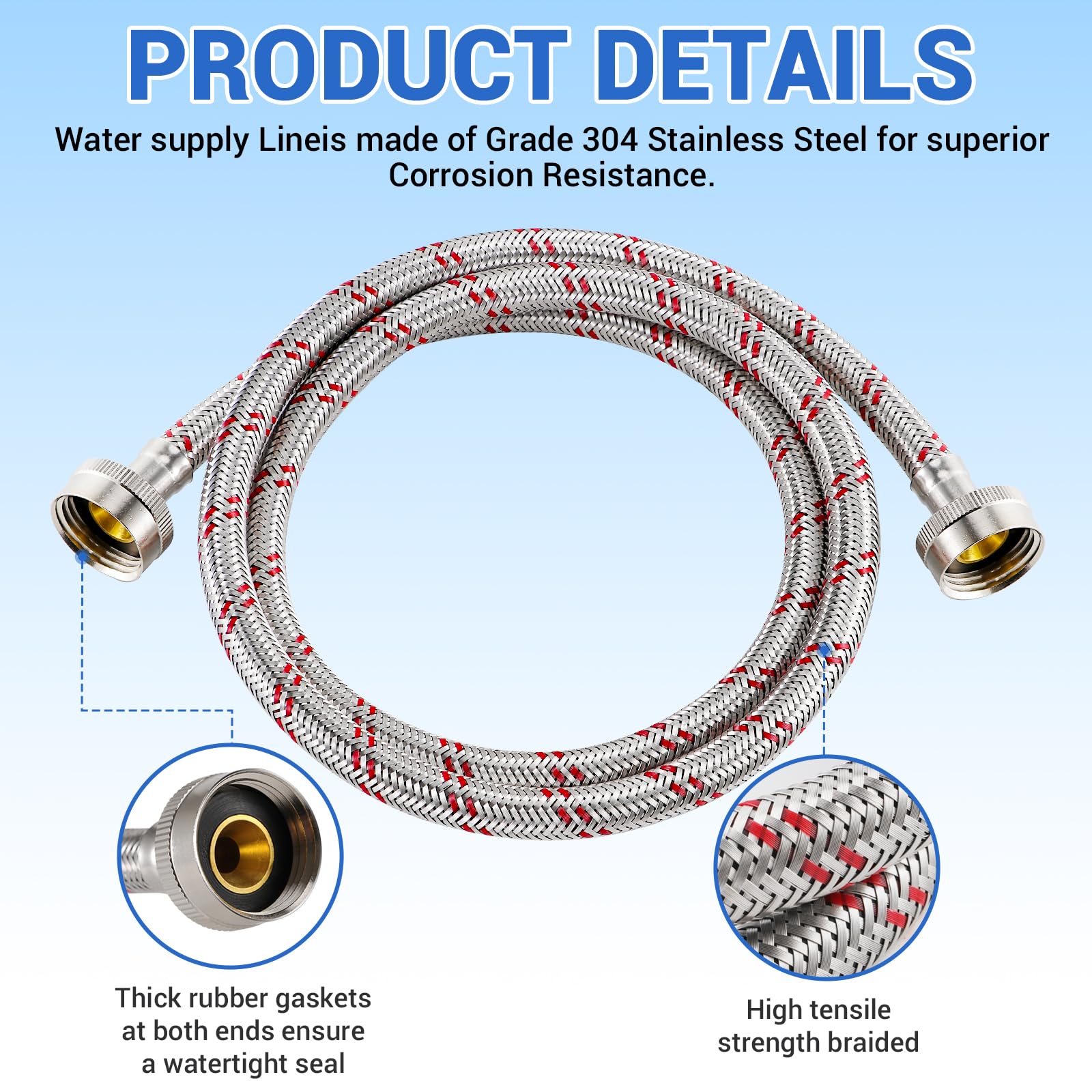 【SAFETY MATERIAL】: Washing machine hoses are made of ultra-high tensile strength braided stainless steel with a two-ply PVC core, which is burst-proof as well as withstands the full flow of water, preventing leakage, curling and corrosion, can be used in both hot and cold environments.
