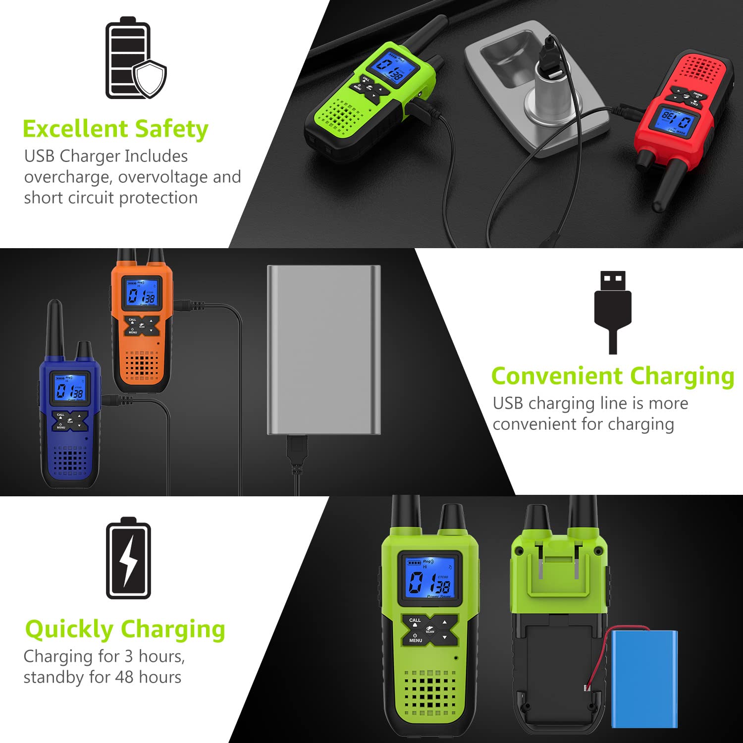 Complete Set for Instant Use : Unbox to find everything you need: rugged walkie talkies for all ages, original earpiece and mic sets for private chats, original USB charger for rapid charging, Y cable for simultaneous charging, high-capacity battery for extended communication time, belt clip and adjustable lanyards for ease of carry. Your one-stop communication solution is here, whether for work, play, or anything in between