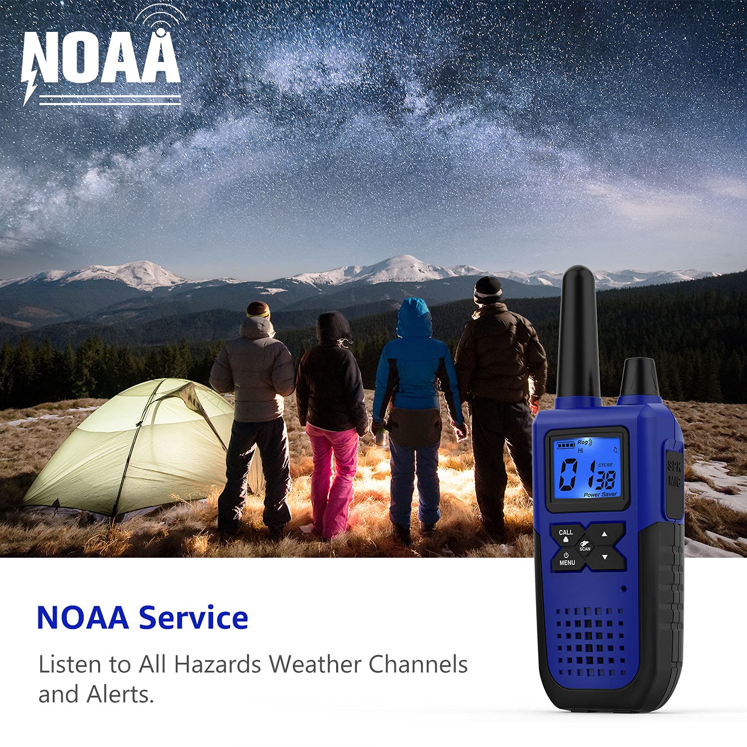 NOAA Weather Service Integration : Get instant NOAA alerts to stay a step ahead of the weather, even when there's no cell service in remote areas. Our walkie talkies offer NOAA's National Weather Service access, keeping you alerted on all hazards weather channels and updates. Whether the skies are clear or the weather turns severe, your family outings are safer and more enjoyable, with less worry about the unpredictability of nature