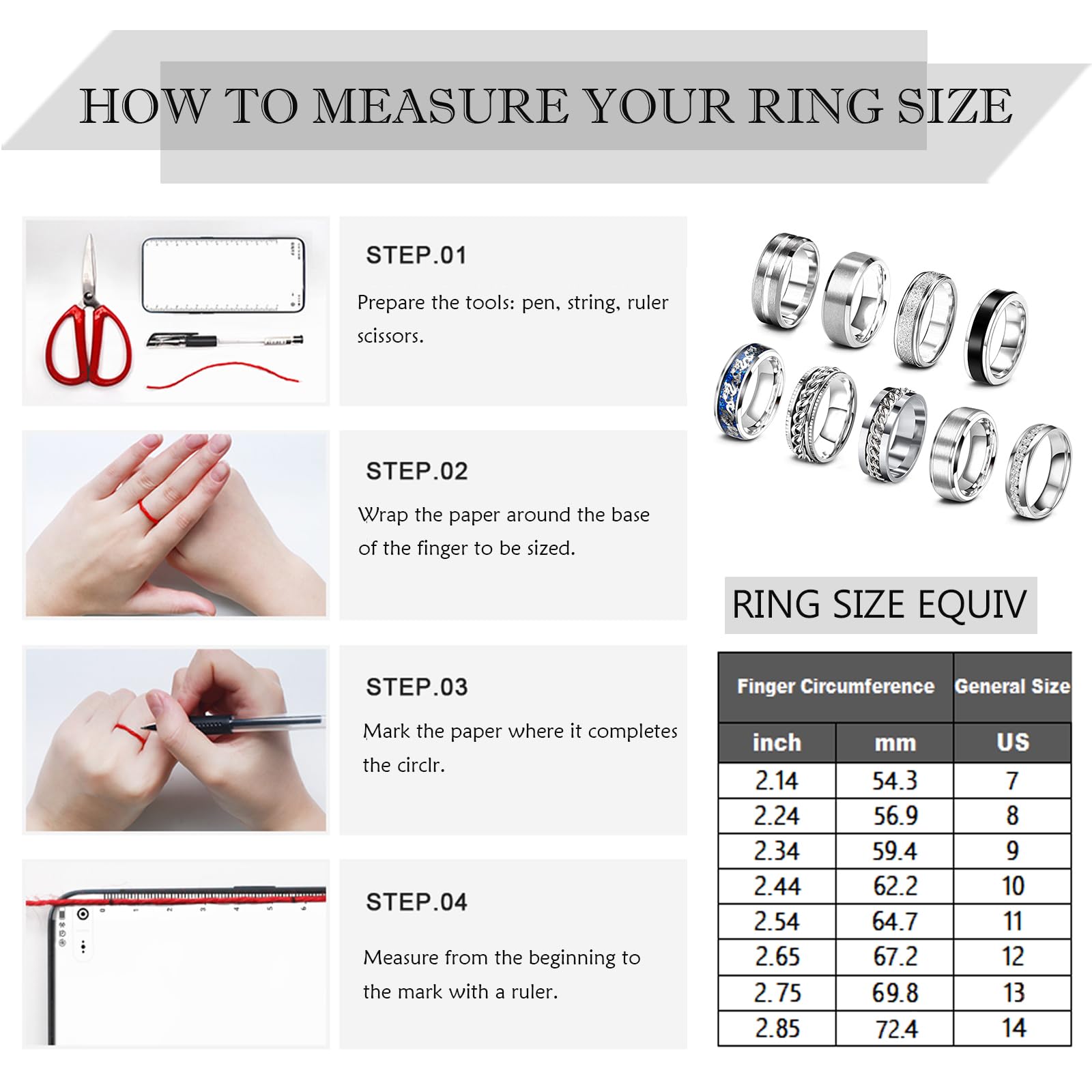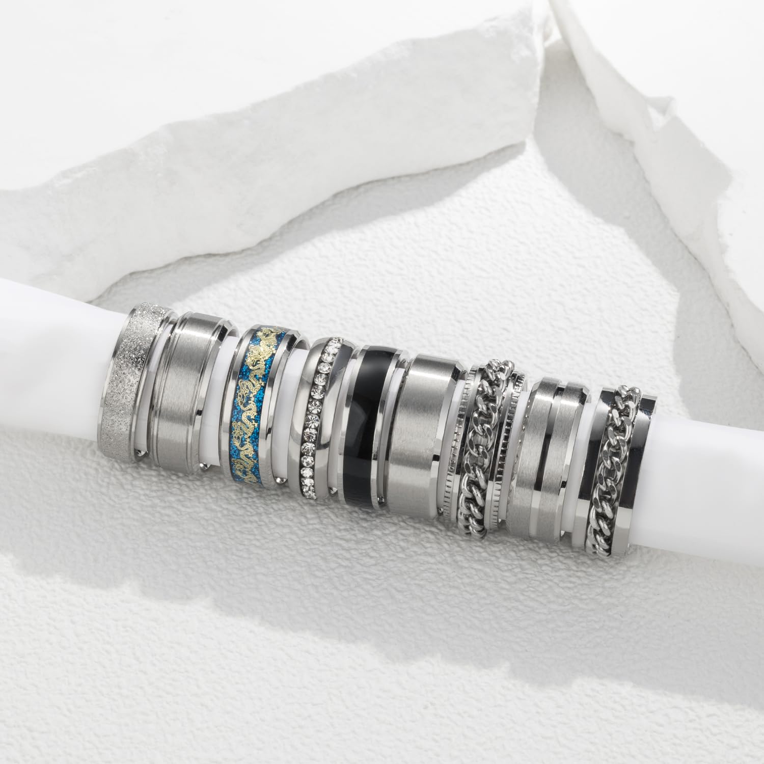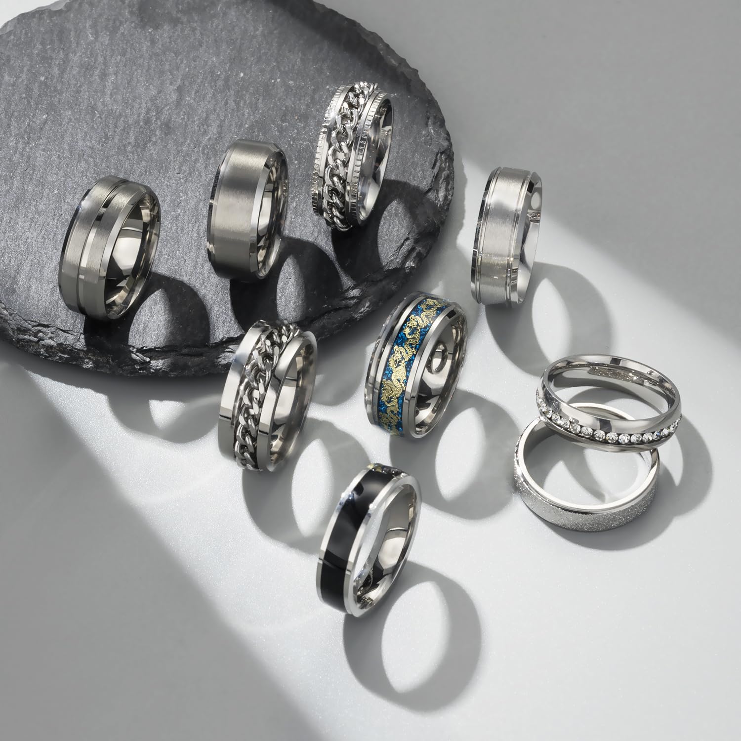 MENS RINGS SET: One order come with 9 pieces stainless steel band rings in various style, 1 pcs dragon pattern beveled edges ring, 2 pcs chain spinner rings, 1 pcs CZ ring, the other 5 pcs cool band rings, smooth and frosted band. 7/8/9/10/11/12/13/14 ring sizes available, suit most men and women.