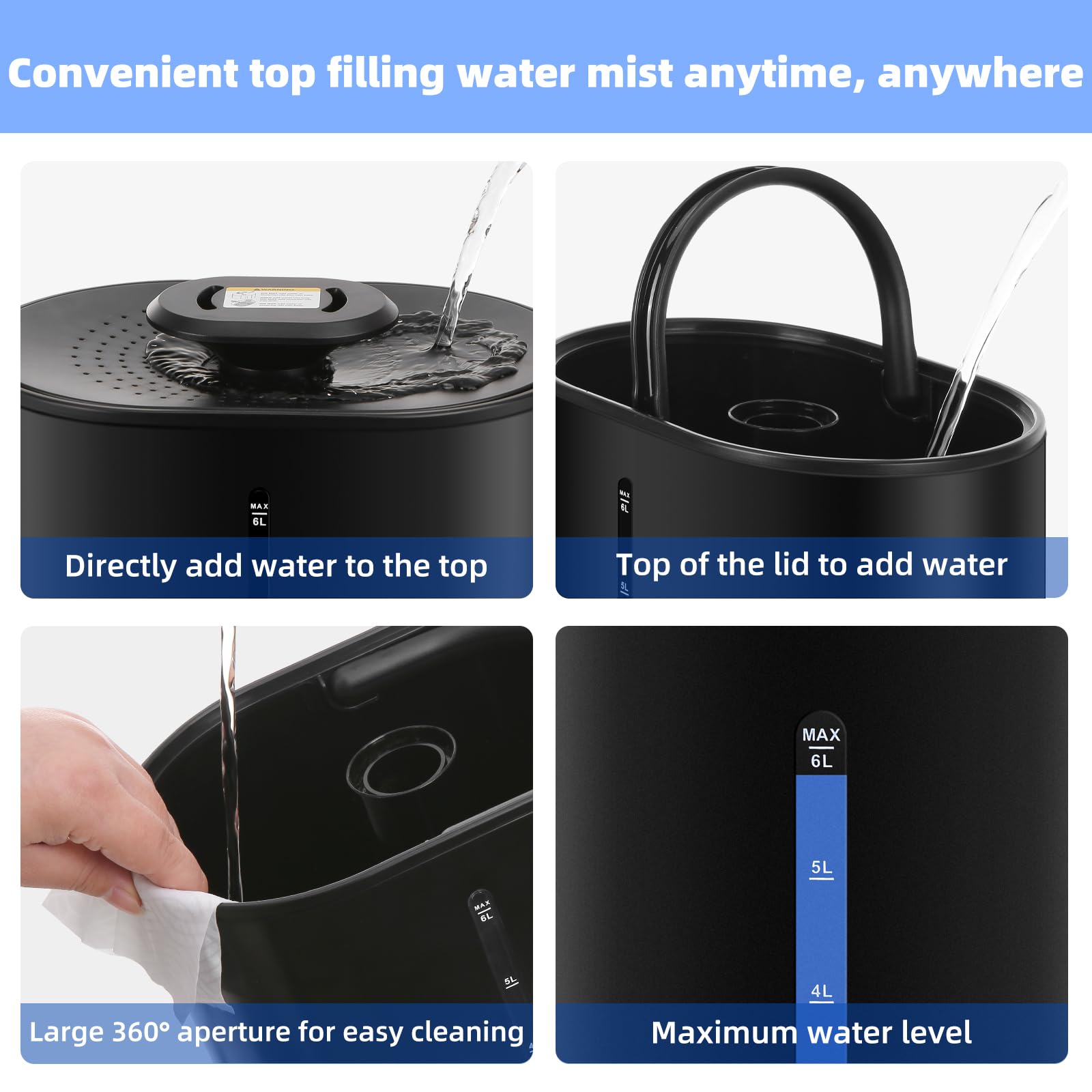 Top-Fill Design for Convenience:Top fill humidifiers design revolutionizes refilling, letting you easily pour water directly into the tank. No tricky angles or tough openings, just pure convenience and a seamless experience.The 6L humidifier for bedrooms, large rooms,nursery, offices, indoor plant humidifiers, that is an ideal choice