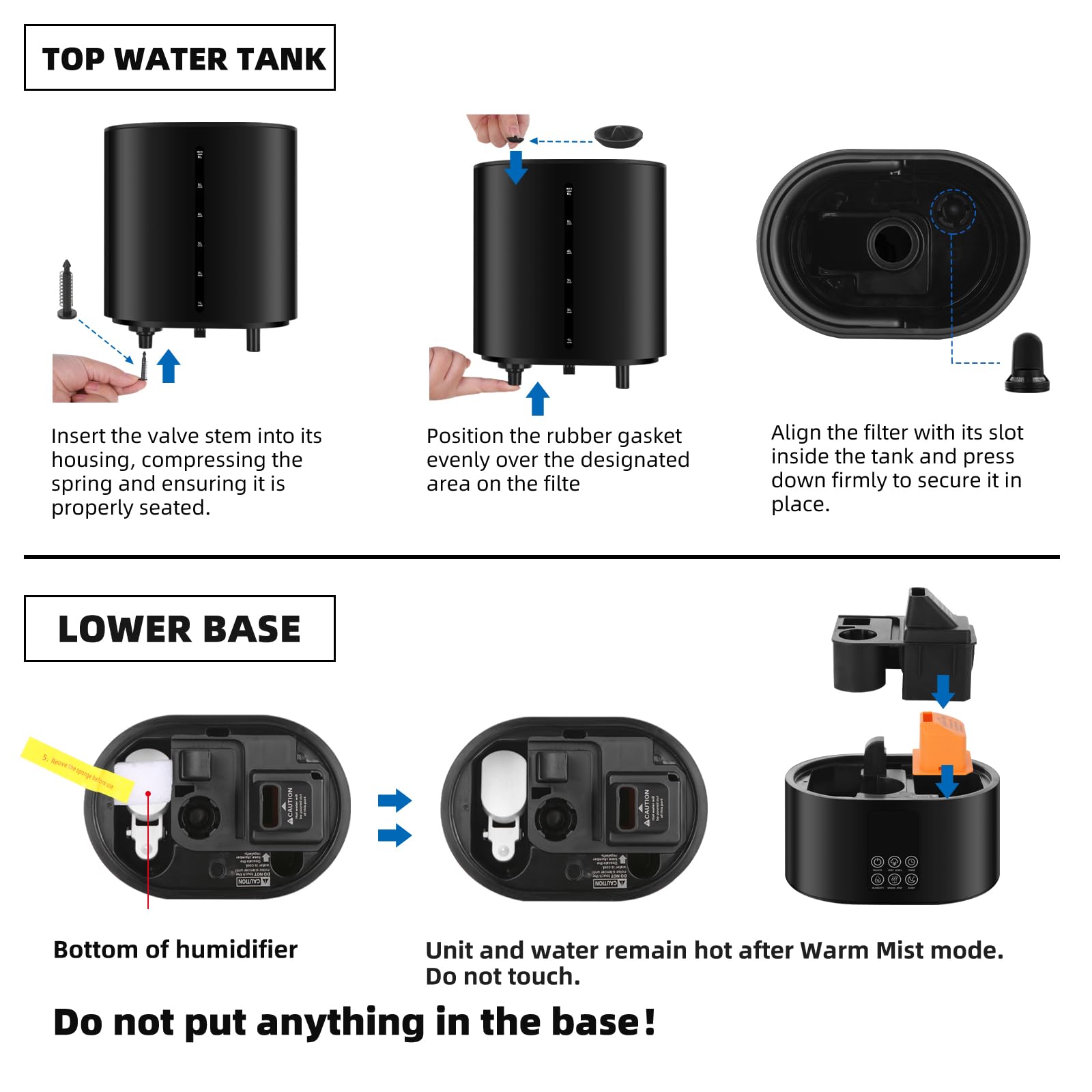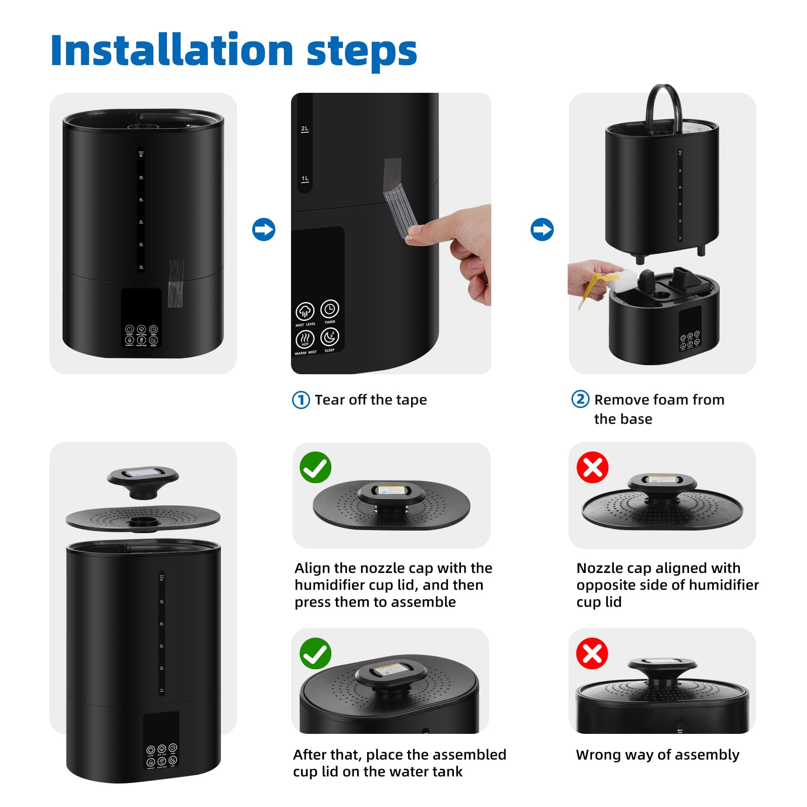 Warm and Cool Mist Humidifiers:Our ultrasonic humidifiers offers both cool and warm mist options, switchable with a single touch. The strong cool mist humidifier the dry room air for improved sleep. The warm mist humidifier is ideal for moisturizing the skin and easing discomfort.Note: Remove the white foam from the base before use