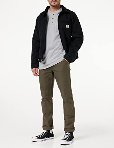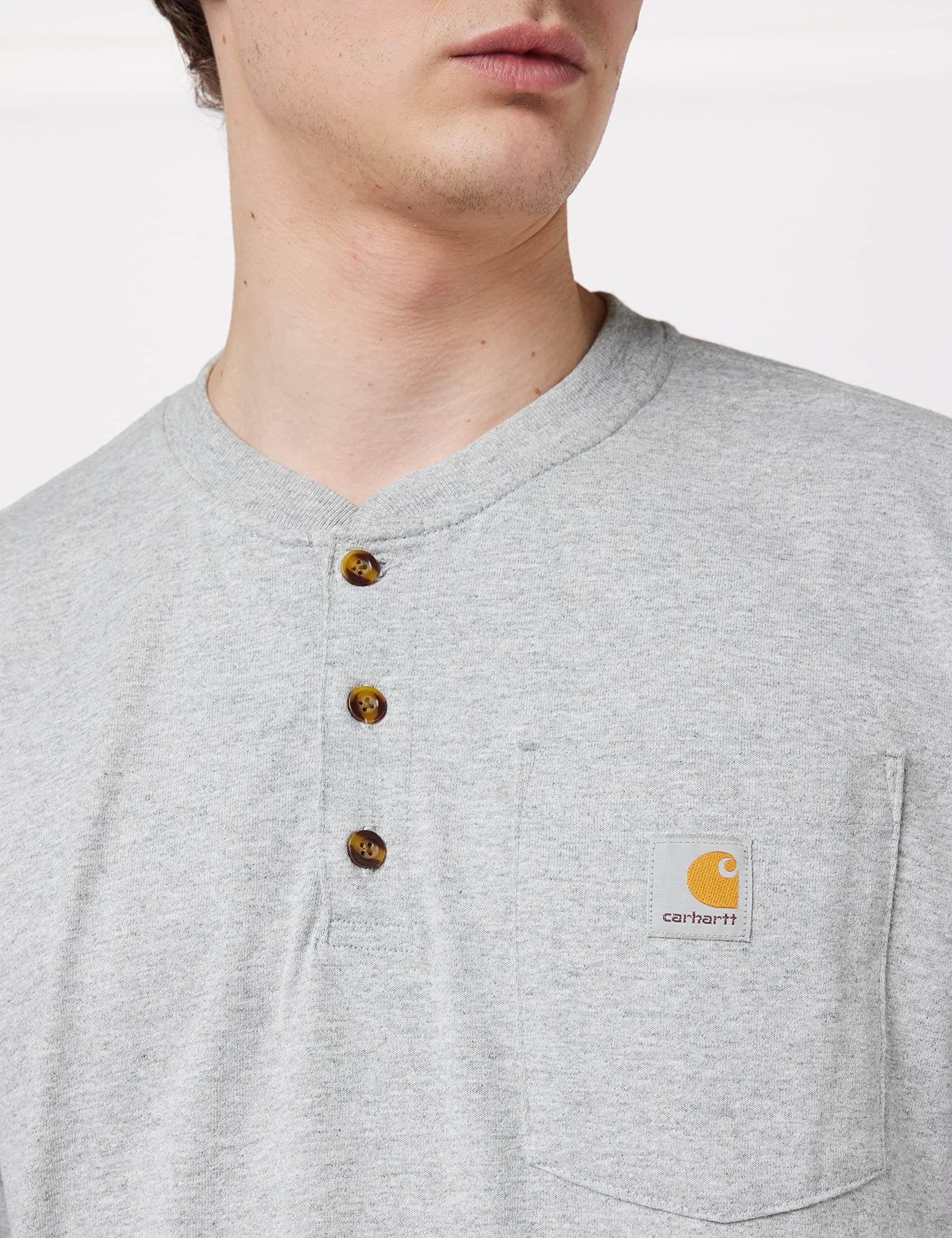 Description Carhartt's long sleeve work wear henley is an all-purpose work shirt that is perfect for cooler days or as a layering piece Made of 675-ounce, 100-percent cotton jersey, it features a rib-knit collar with a three-button closure and a left chest pocket It also has side-seamed construction to minimize twisting and maximize comfort ash fiber content is 99-percent , 1-percent polyester Heather gray fiber content is 90-percent cotton , 10-percent polyester