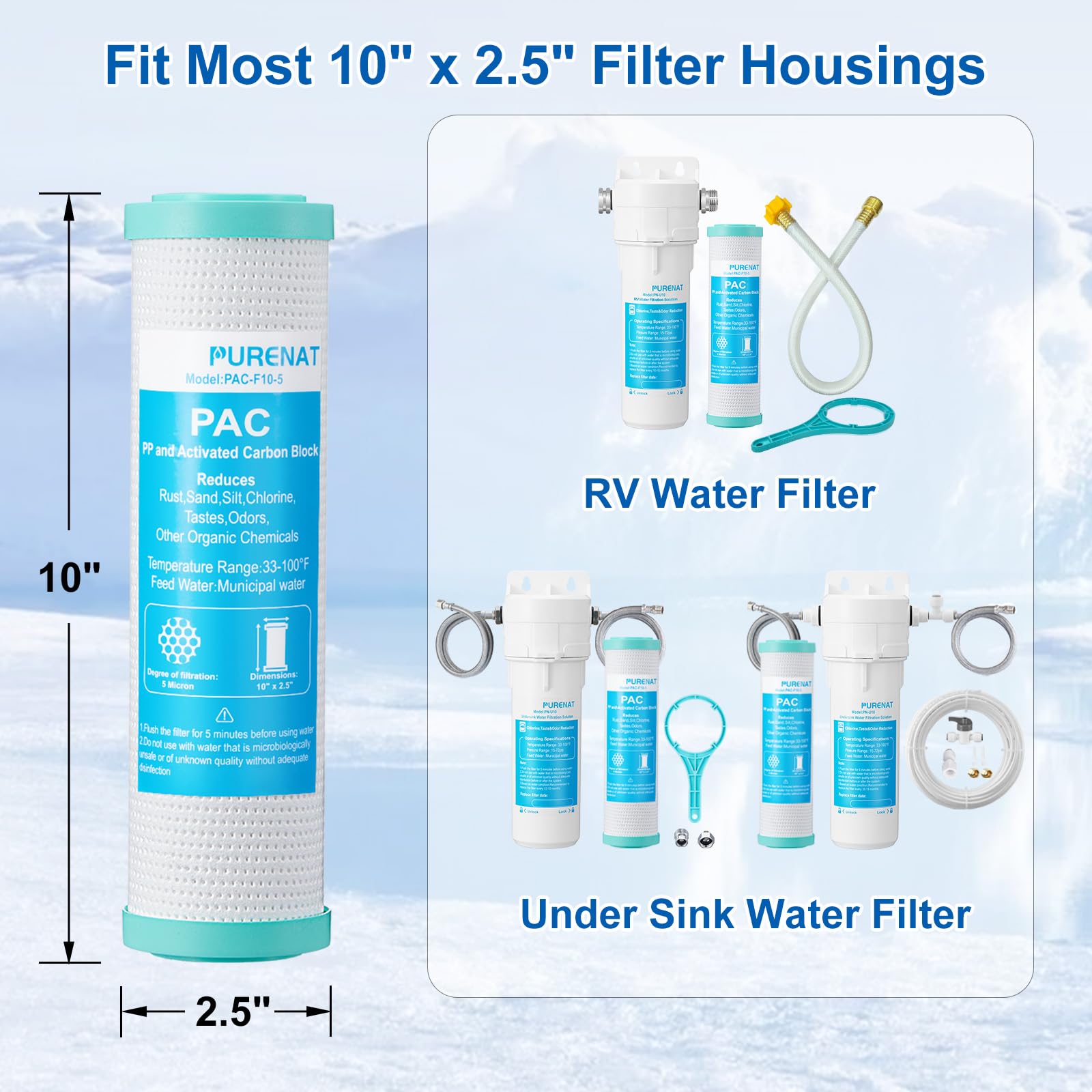 【10" Universal Replacement Filter】:The 5 micron 10" x 2.5" PP and carbon block compound filter is suitable for most under sink filtration system,three-pillar RO filter system,RV water filtration,whole house filtration system,countertop drinking water filter and catchment system,they are all with standard 10-inch fiter housing.
