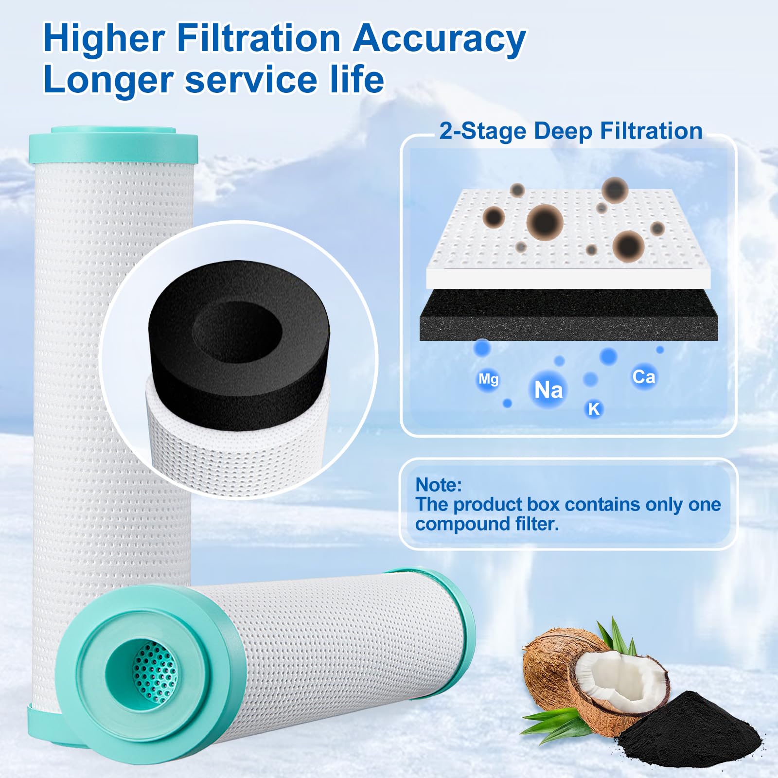 【Long Service Life】:If the water quality is not very good,the outer PP layer can effectively filter some large particles in the water,which is a good protection for the inner layer of carbon block,compared with only carbon block material cartridge,the service life of this cartridge will be longer.