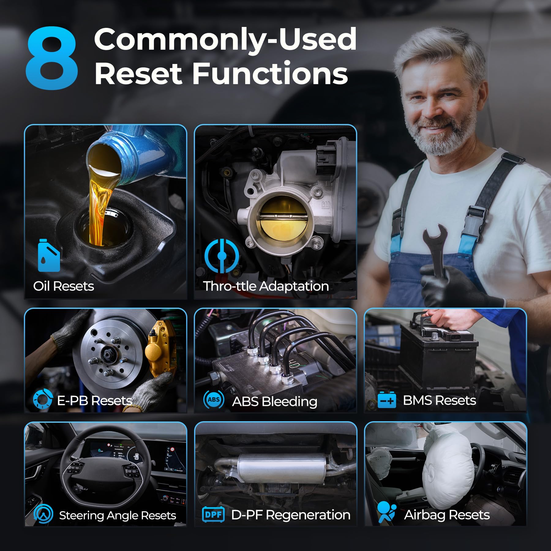 [8 HOT Reset Services]: The TOPDON scanner for car supports 8 of the most popular services, including Oil Resets, Throttle Adaptation, EPB Resets, Steering Angle Resets, DPF Regeneration, ABS Bleeding, BMS Resets, Airbag Resets, and the list is still growing. Offers daily service and maintenance to 99% global cars.