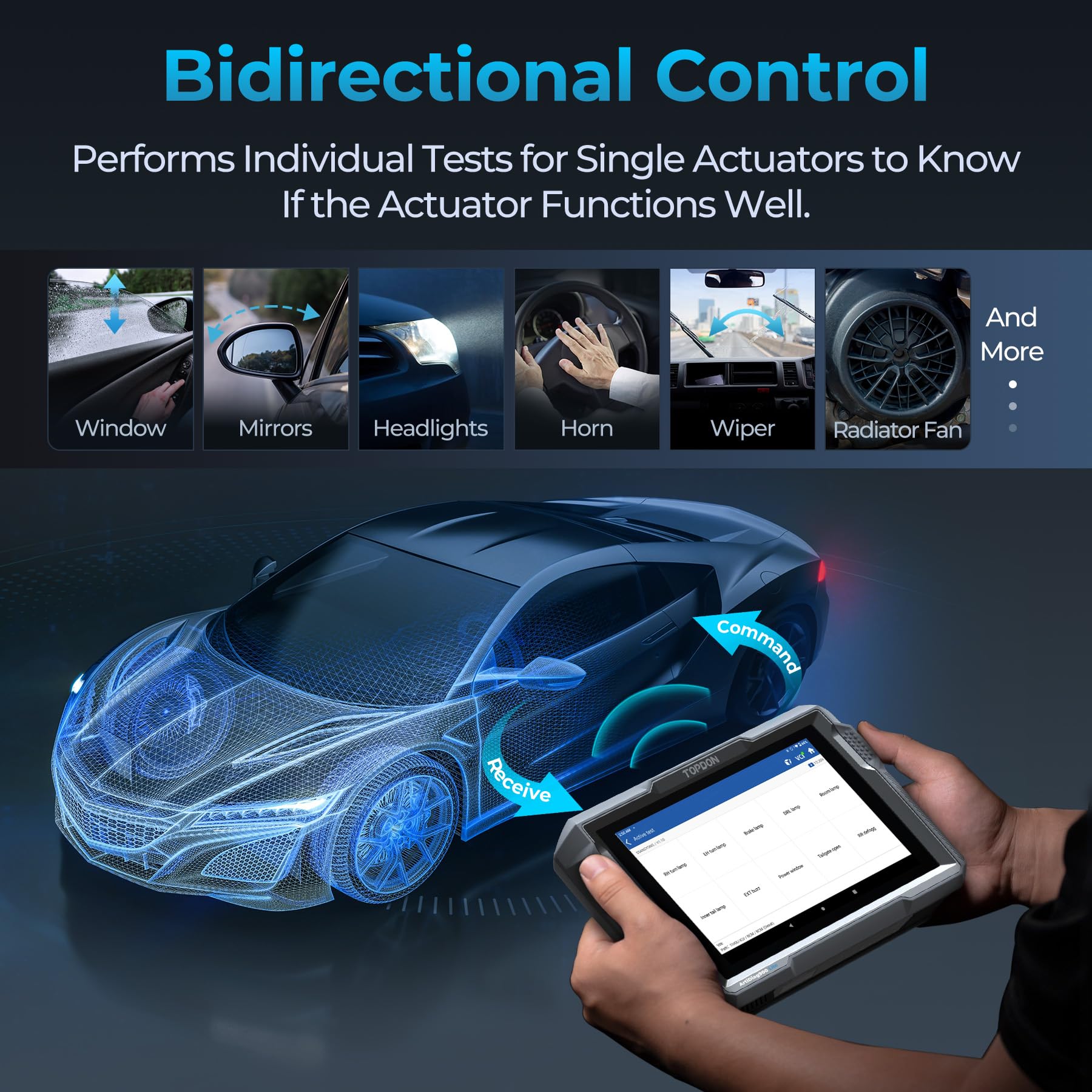 [TOPDON's Newly Bidirectional Scan Tool]: This bidirectional obd2 scanner sends commands to the vehicle's ECU for active testing, enabling users to accurately and quickly locate faulty components such as injectors, coolant pumps, windows, wipers, headlights, mirrors, etc. The bidirectional control scanner is the ideal choice for workshops/automotive repair shops as it significantly reduces mechanic's diagnostic time.