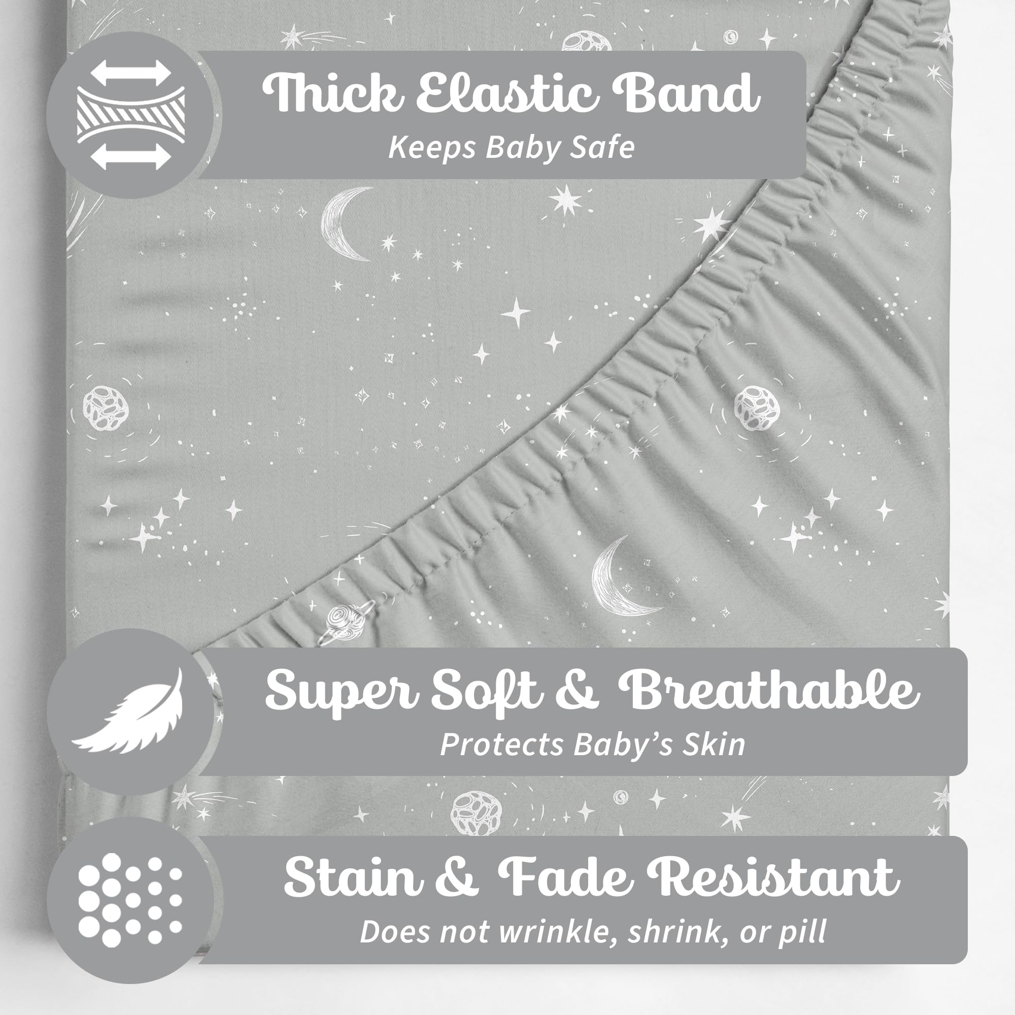 π BEAUTIFUL DESIGN, UNBELIEVABLY SOFT MATERIAL β This beautiful custom pattern is printed on the most luxuriously premium cotton blend. Thicker elastic and deeper pockets ensure that our baby mattress sheets for crib will NOT slip off the mattress. Youβll feel the soft, yet stretchy and silky material as you pull the sheets and snug, creating a safe and soothing space for your baby to sleep.