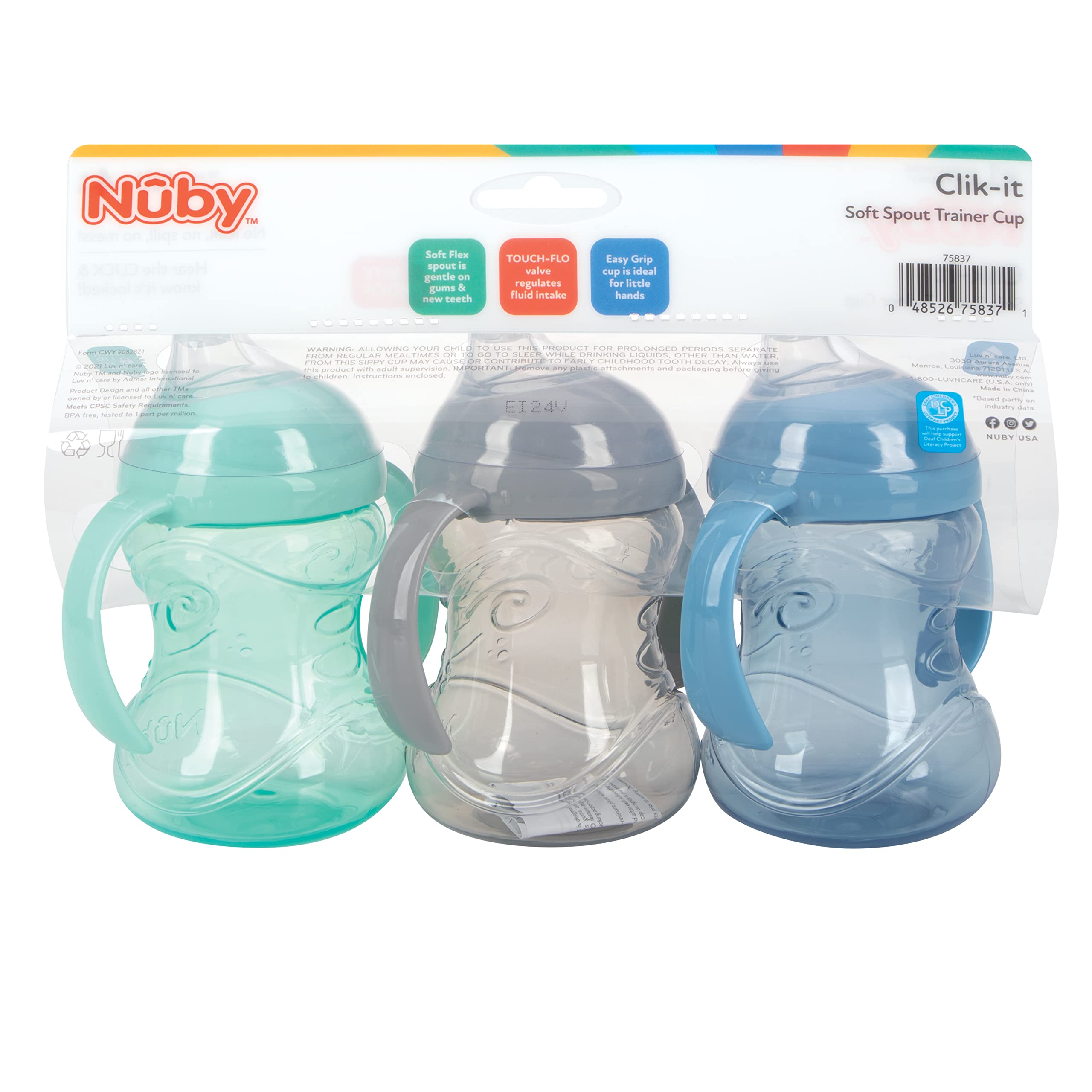 SIPPY CUP FOR KIDS 4+ MONTHS: Nuby's Clik-It No-Spill Soft Spout Sippy Cup holds up to 10 ounces (300 ml) of water, milk, or juice; It's the perfect cup for spill-prone babies at home or on the go