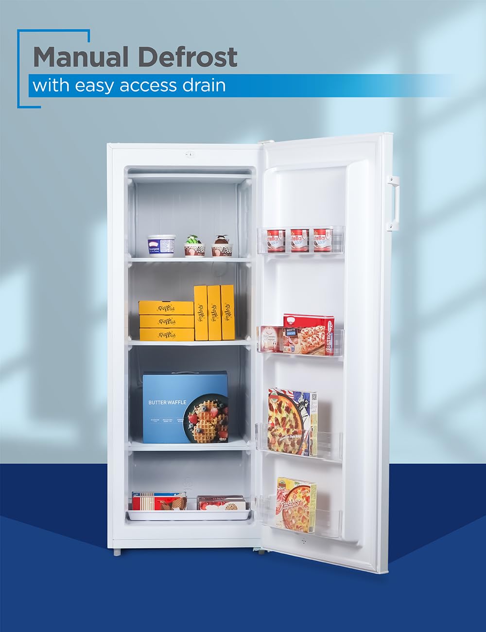 Efficient Storage Solutions: Featuring 3 full-width freezer shelves and 4 door bins, this standing freezer upright provides organized storage and easy access to your frozen items
