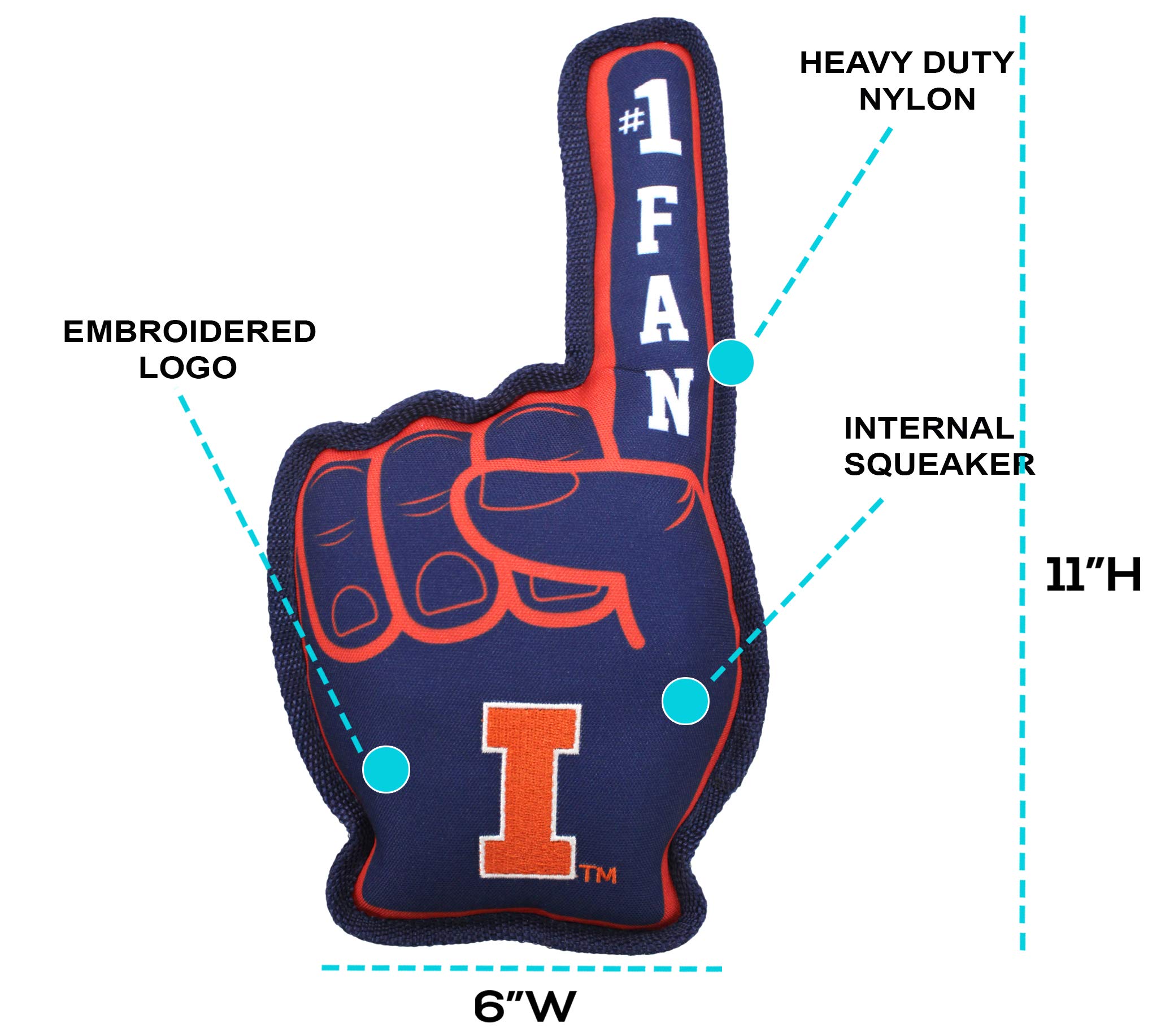 FEATURES: The Pets First foam finger shaped #1 Fan Toy features your favorite Collegiate TEAM NAME and LOGO in vibrant team colors! Double stitched trim, Tough Nylon material Polyfilled with Chewable Materials.It has a squeaker too to keep your dog enthused all day long!