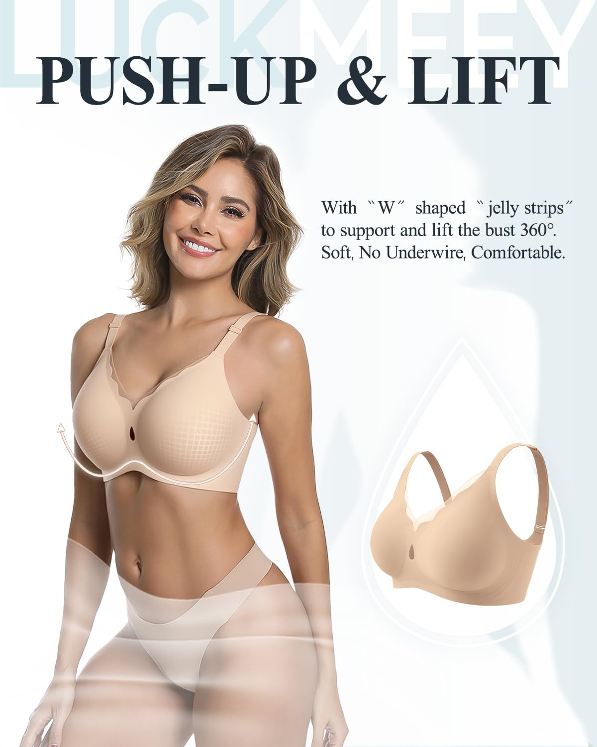 "W" Shaped Support & Lift - Equipped with unique "W" shaped jelly strips that provide 360° support and lift from underneath. The semi-fixed padding helps create a naturally rounded and fuller shape, offering comfort and support for all ages.