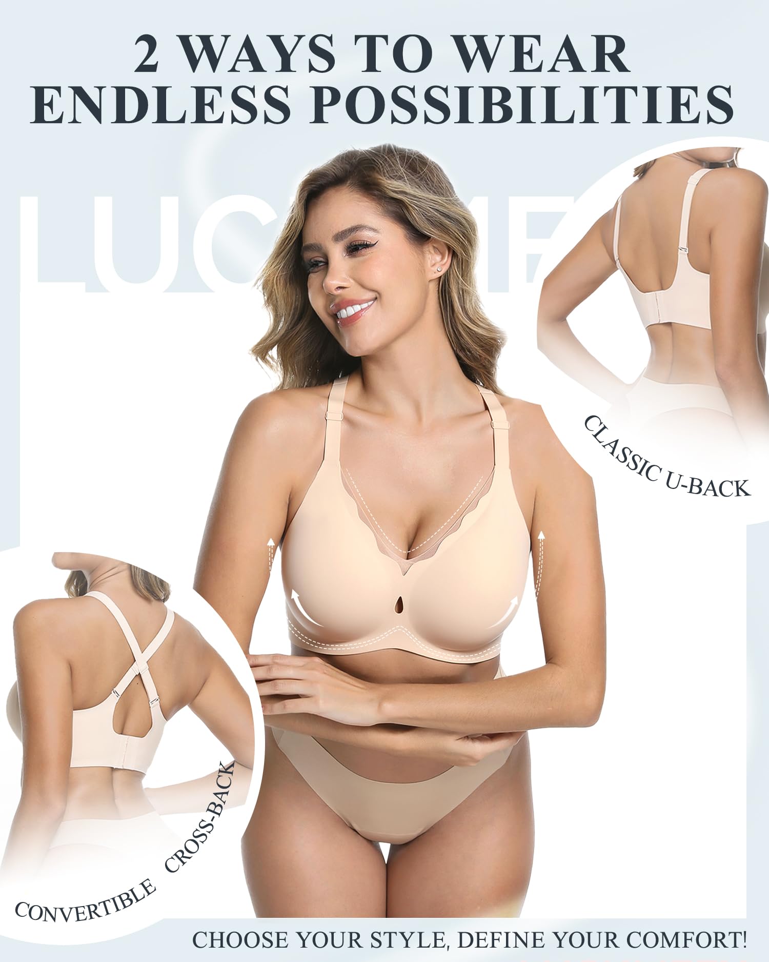 2-Way Convertible & Smoothing U-Back - The adjustable straps can be worn traditionally or crossed for versatility and better lift. The U-back design with wide side straps effectively conceals back fat and underarm bulges, ensuring a smoother look under all your outfits.