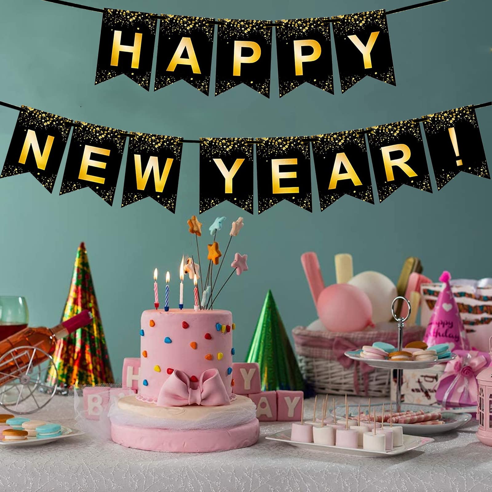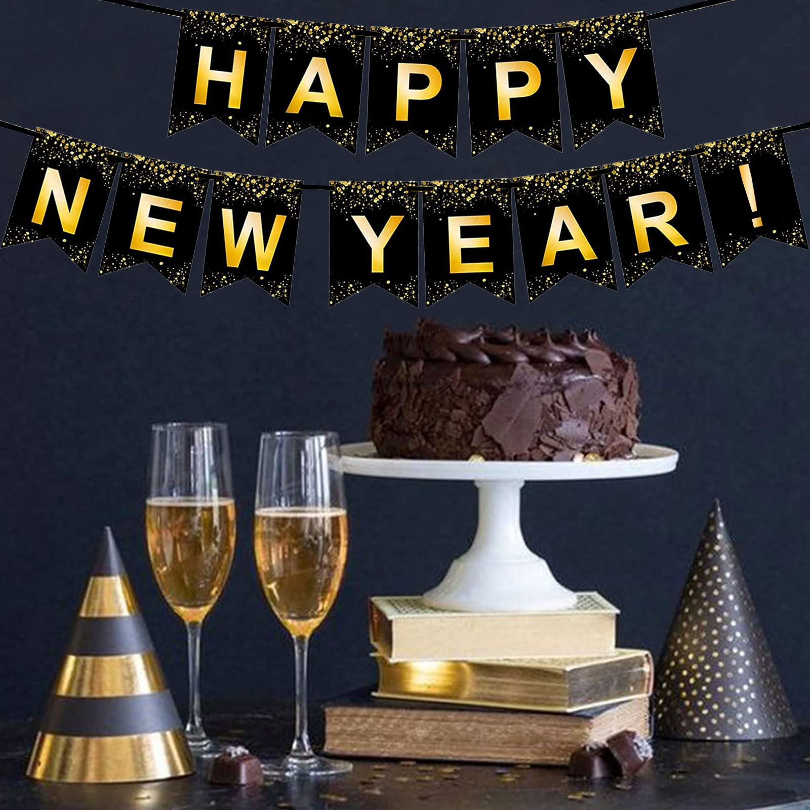 Color: Happy new year banner is black and Gold;It's a starlight design. This is a classic timeless color scheme that makes your new year party even more luxurious and atmospheric.
