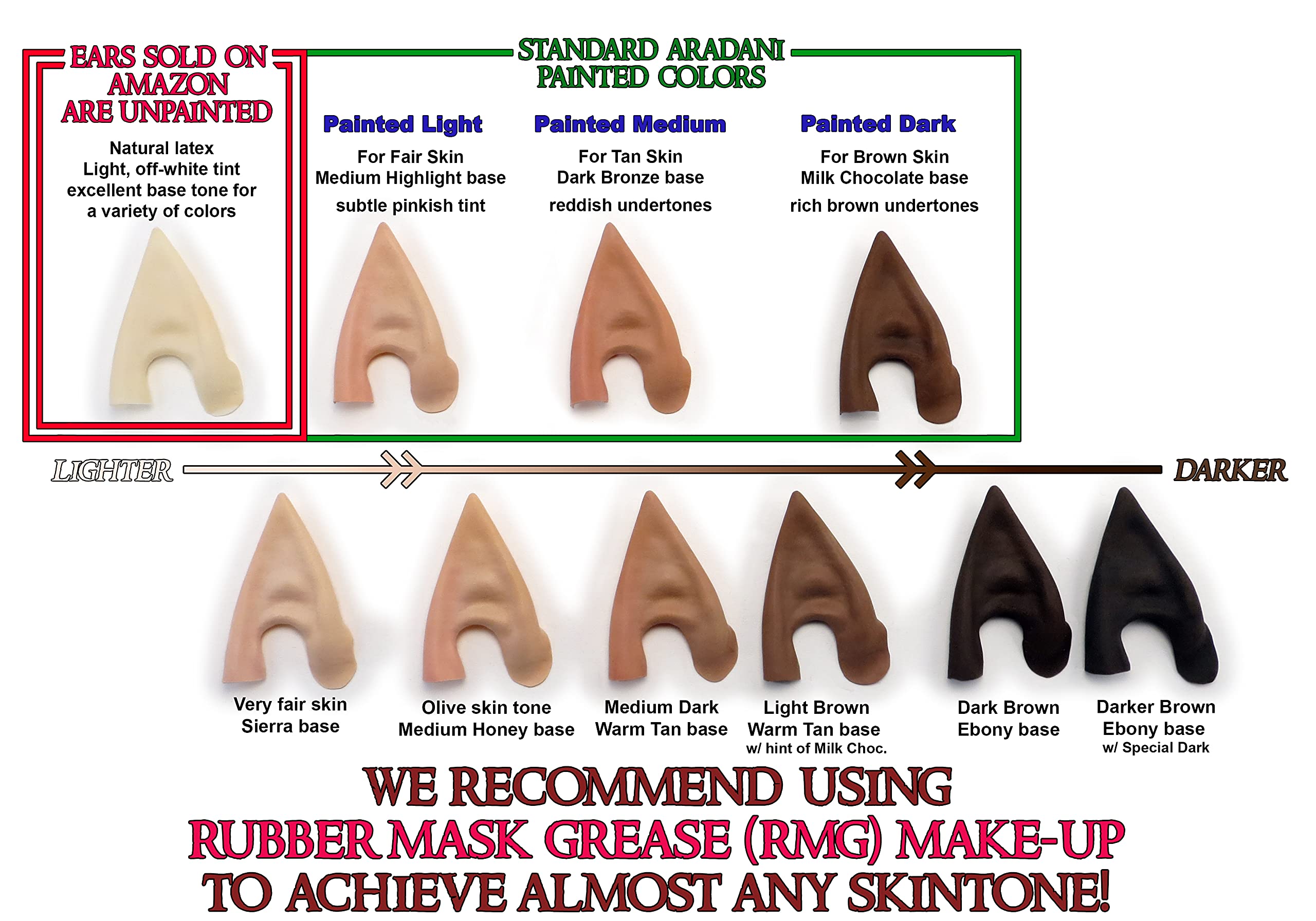 Aradani Studios elf ears are considered by many as the best costume prosthetics in the world. These are hand crafted in our home studio in Nashville, TN, by the artists of Aradani, with attention to detail and quality. Not only do we hand-make and inspect each set of ears, we try to use the highest quality materials we can find. Often on the road we are told our ears last for years of use, with some people coming back with the same ears after 6-7 years of wearing them! PAINTING YOUR EARS The primary photo shows the ears painted in a light skintone, however all Aradani Elf Ears sold on Amazon are unpainted latex, which as a natural product can vary in color. While this natural color is close to a fair skintone, the ears will look much better and realistic if they are painted to match your skin. The best make-up to use is called RMG, rubber mask grease paint. Just be careful NOT to use any make-up that contains mineral oil. GLUING ON YOUR EARS We recommend using spirit gum (sold separately) to attach your ears. The ears will not stay on without an adhesive such as spirit gum or liquid latex. HIDING THE SEAMS The edge seams can be blended in with latex, though we recommend covering the seam with the use of an ear cuff as shown in the picture. ONE SIZE FITS MOST Because our ears are made from molds, they may not be a perfect fit for you. We like to say that our ears are one-size-fits-most. Some styles fit smaller ears better, some fit larger ears better. If you need assistance, please contact us and we can offer advice on what style of ear to best fit your ears, which style to best match a certain cosplay, or any advice on make-up and special effects in general. Remember: Spirit Gum Sold Separately. Ears are unpainted.