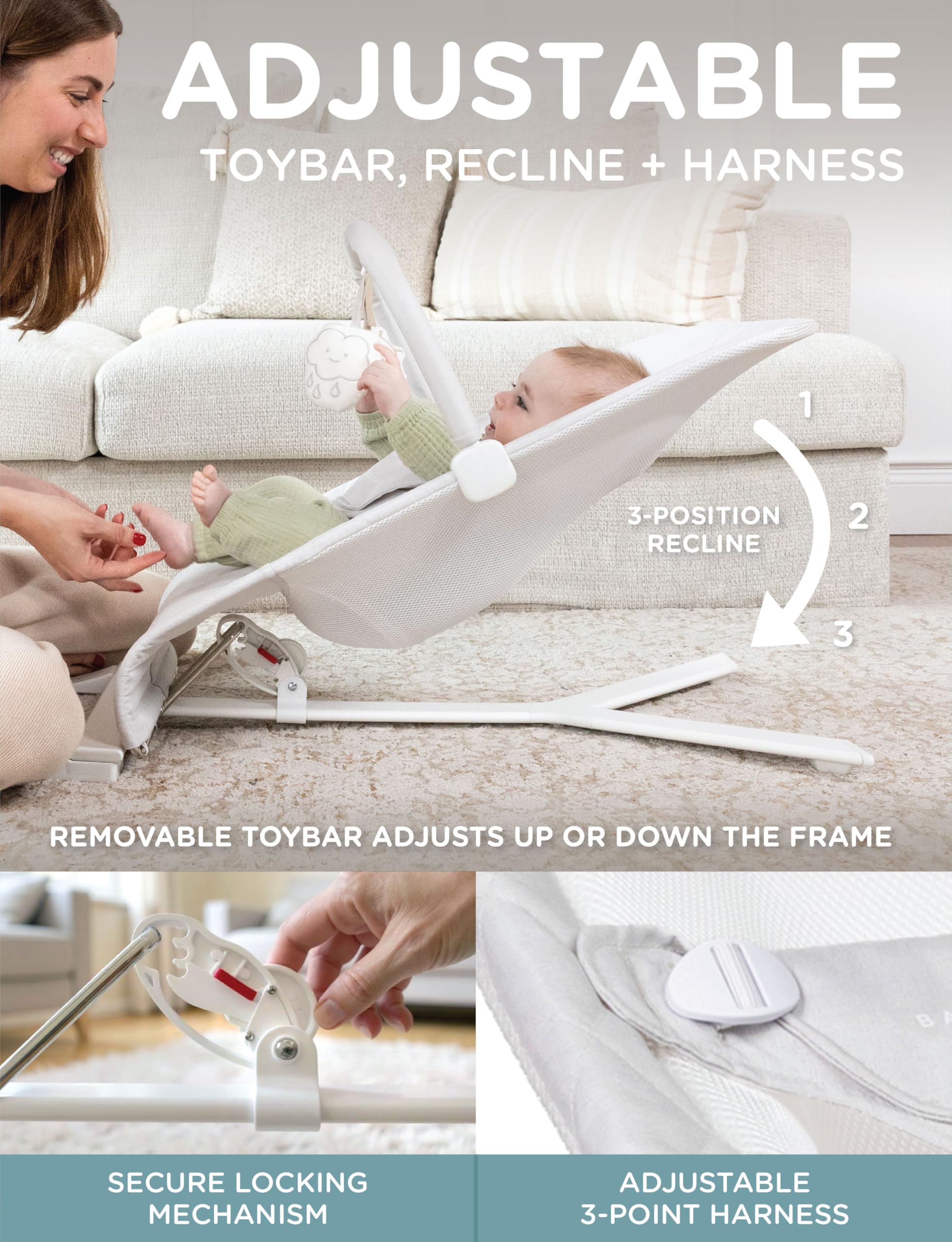 OPTIMAL COMFORT: For ultimate comfort of your baby, we designed this portable bouncer to have 3 different reclining positions. Sit, paly or, relax; your baby can do it all in our portable bouncer.